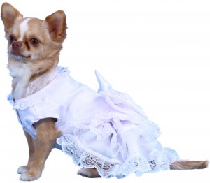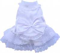 Abitino da cerimonia per cani bianco in organza con balze orlate di pizzo. Grande fiocco in vita e chiusura velcro.