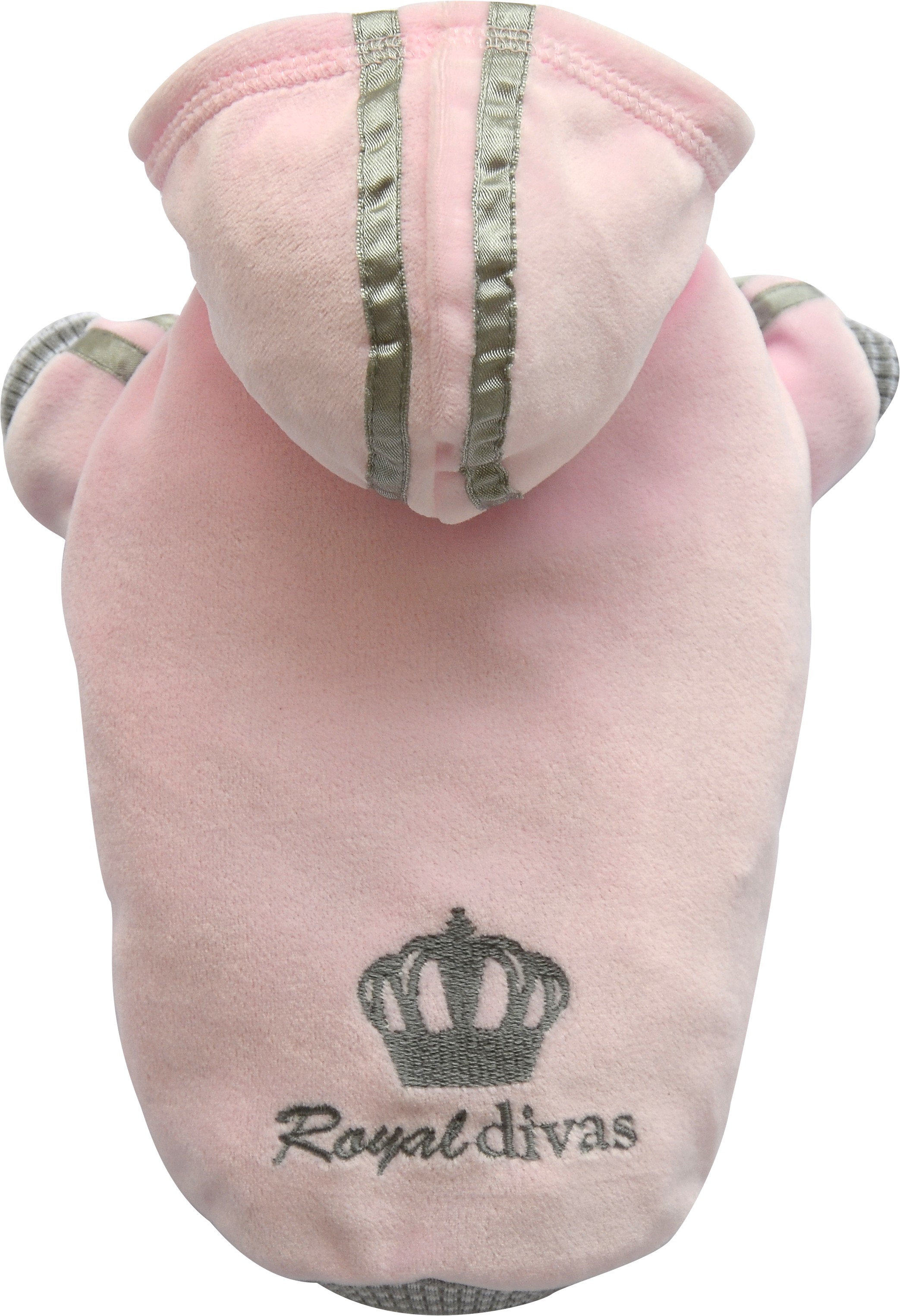 Felpa rosa per cani in ciniglia con cappuccio e bordi elasticizzati. Bande in contrasto color grigio e corona ricamata.