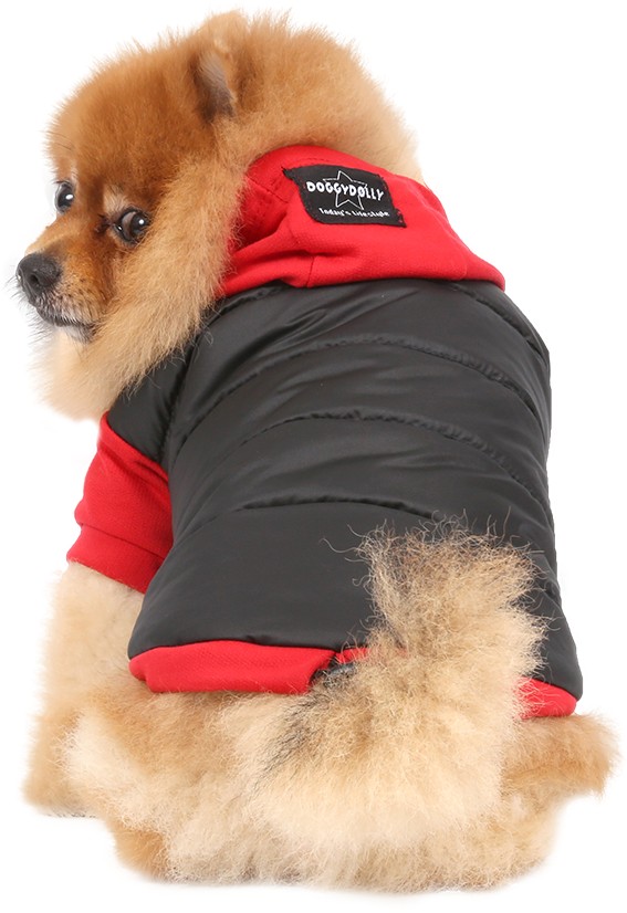 Giubbino per cani imbottito ed impermeabile bicolore. Coulisse regolabile sul fondo, cappuccio e chiusura velcro.