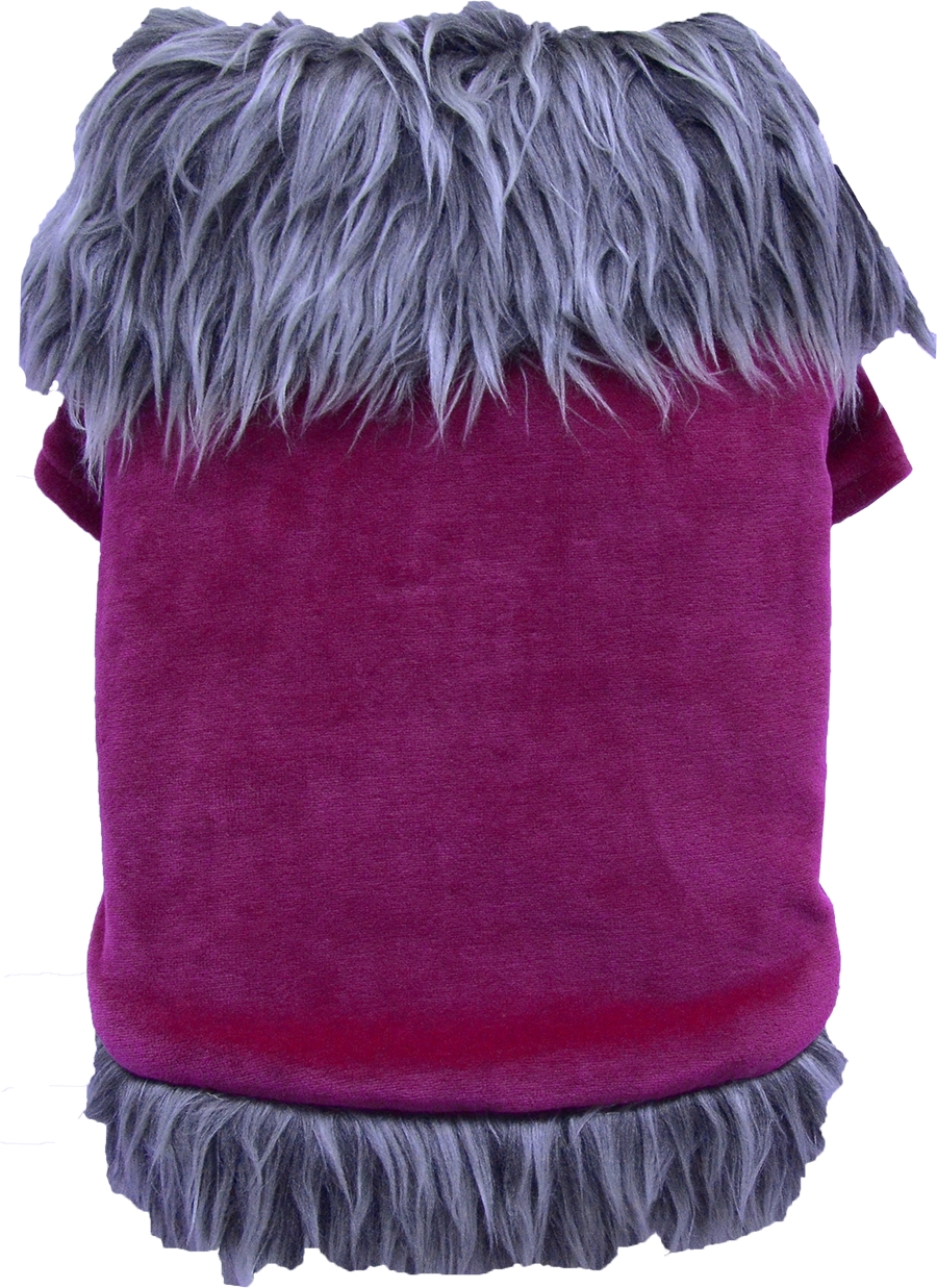 Giubbino per cani in ciniglia color vinaccia, interno caldo pile. Bordato con pelo sintetico. Chiusura in velcro.