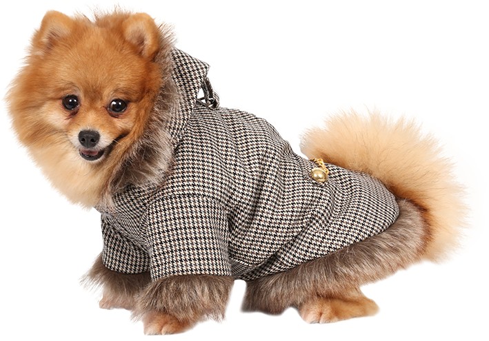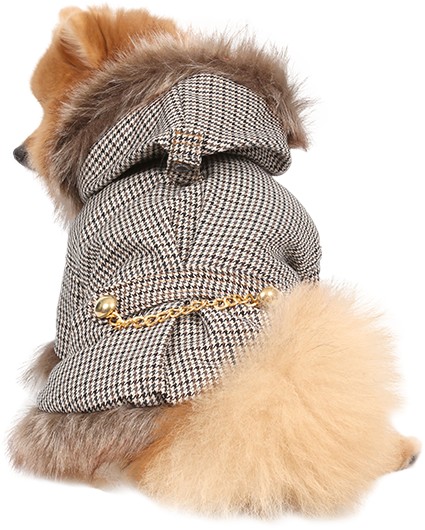 Elegante giubbino imbottito bordato di pelo rigorosamente sintetico ed arricchito da martingala con catenella dorata. Cappuccio e chiusura velcro.