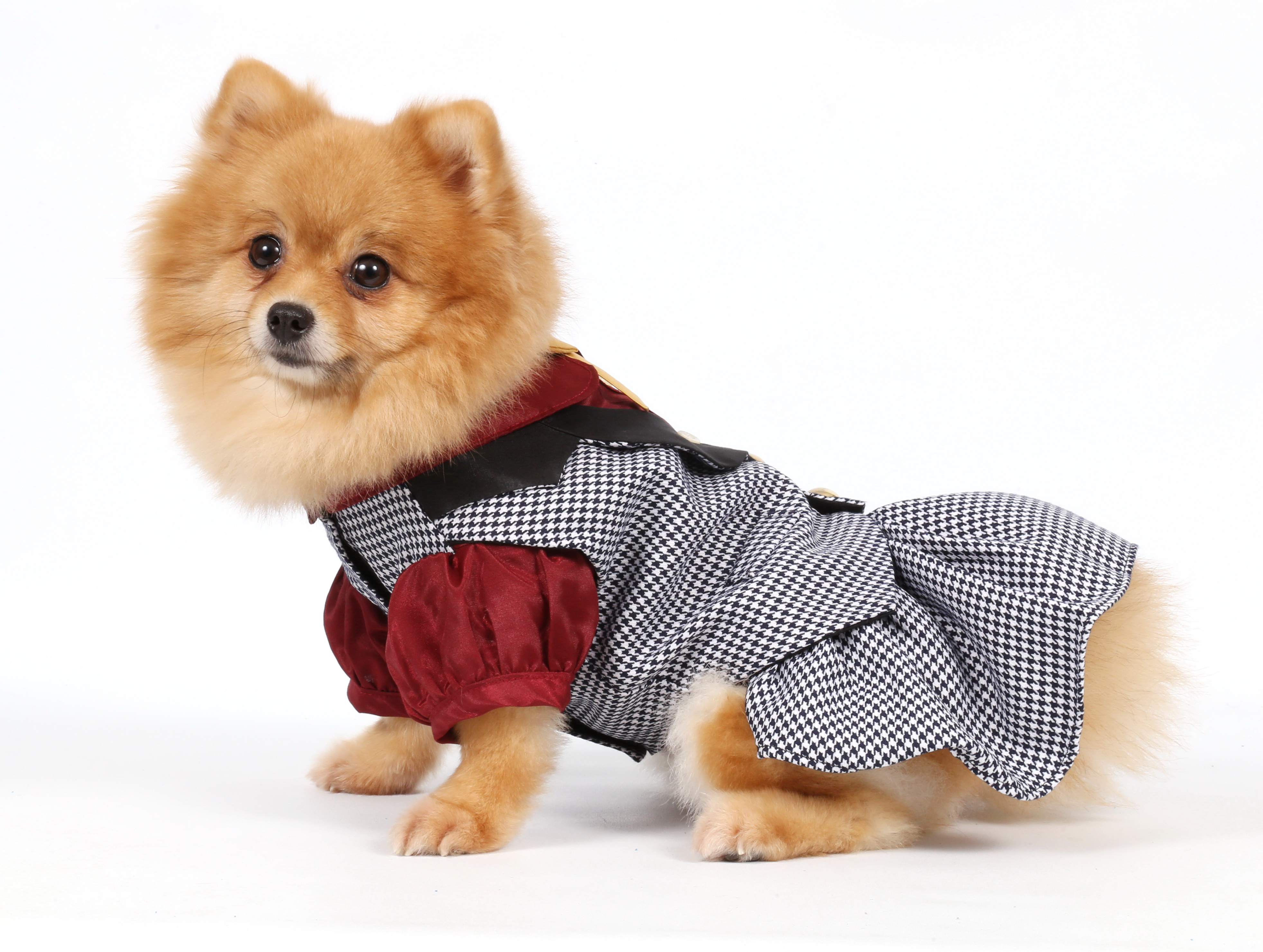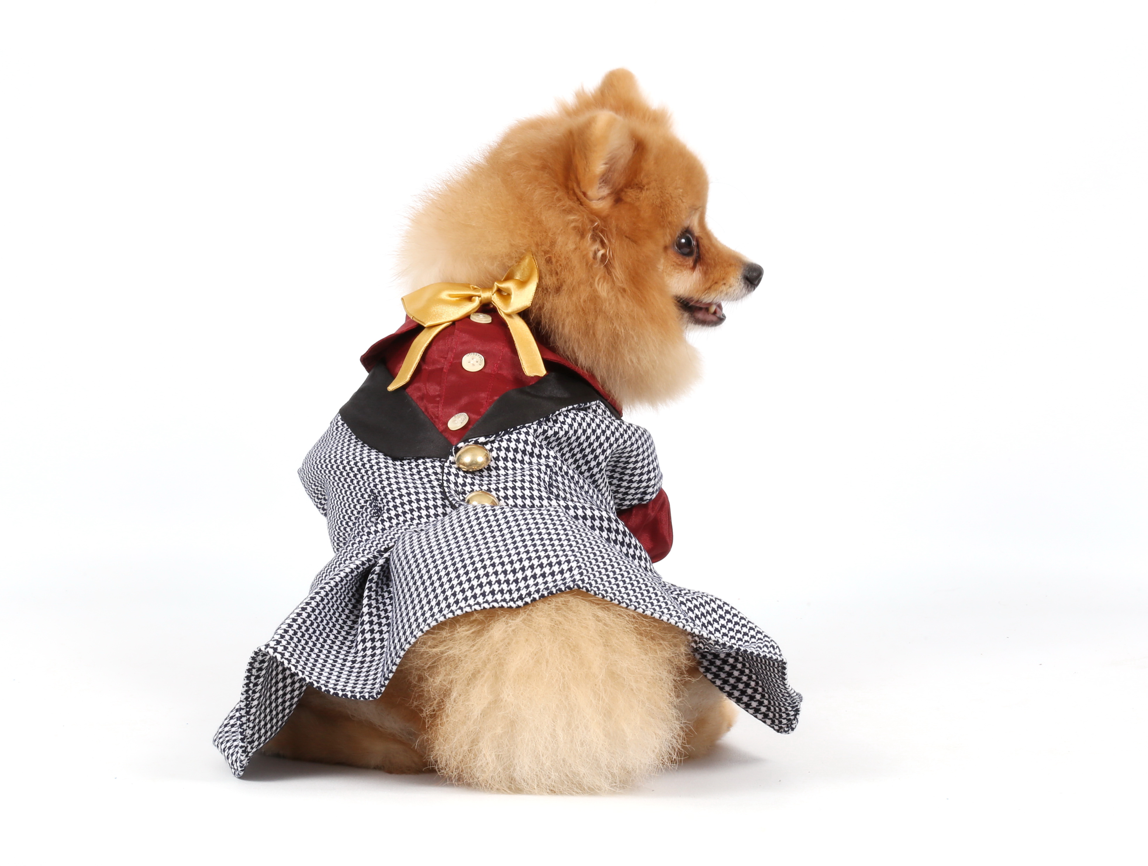 Elegante vestitino per cani con gilet arricchito da bottoni dorati e papillon color oro in contrasto alla camicia bordeaux. Chiusura velcro.
