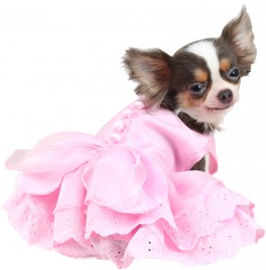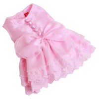 Elegante vestitino rosa per cani con corpetto in organza e gonna a balze impreziosita da pizzo sangallo. Grande fiocco nello stesso colore in vita. Chiusura velcro.