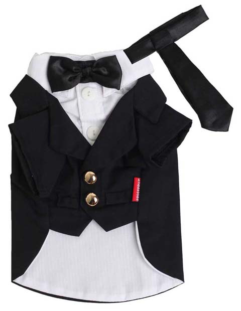 Elegante smoking per cani nero impreziosito da bottoni dorati. La camicia bianca è in contrasto col papillon nero che rimane sulla gola. All'interno della confezione troverete un cravattino in alternativa al papillon. Chiusura velcro.