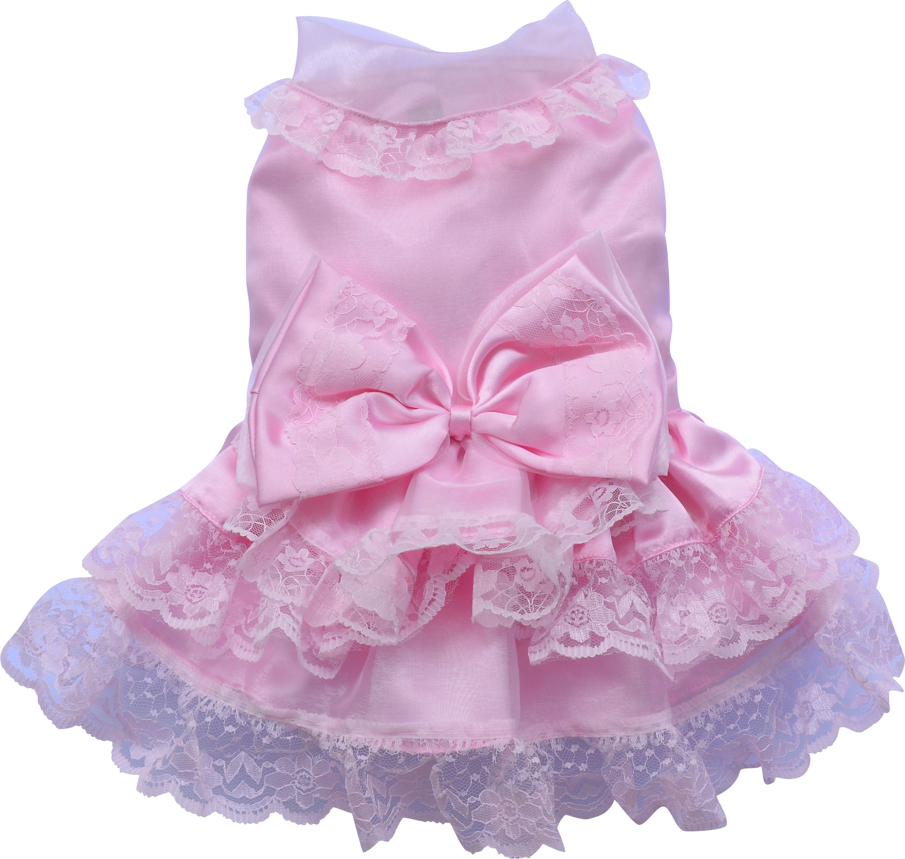 Abitino da matrimonio per cani in organza rosa con balze orlate di pizzo. Grande fiocco in vita e chiusura velcro.