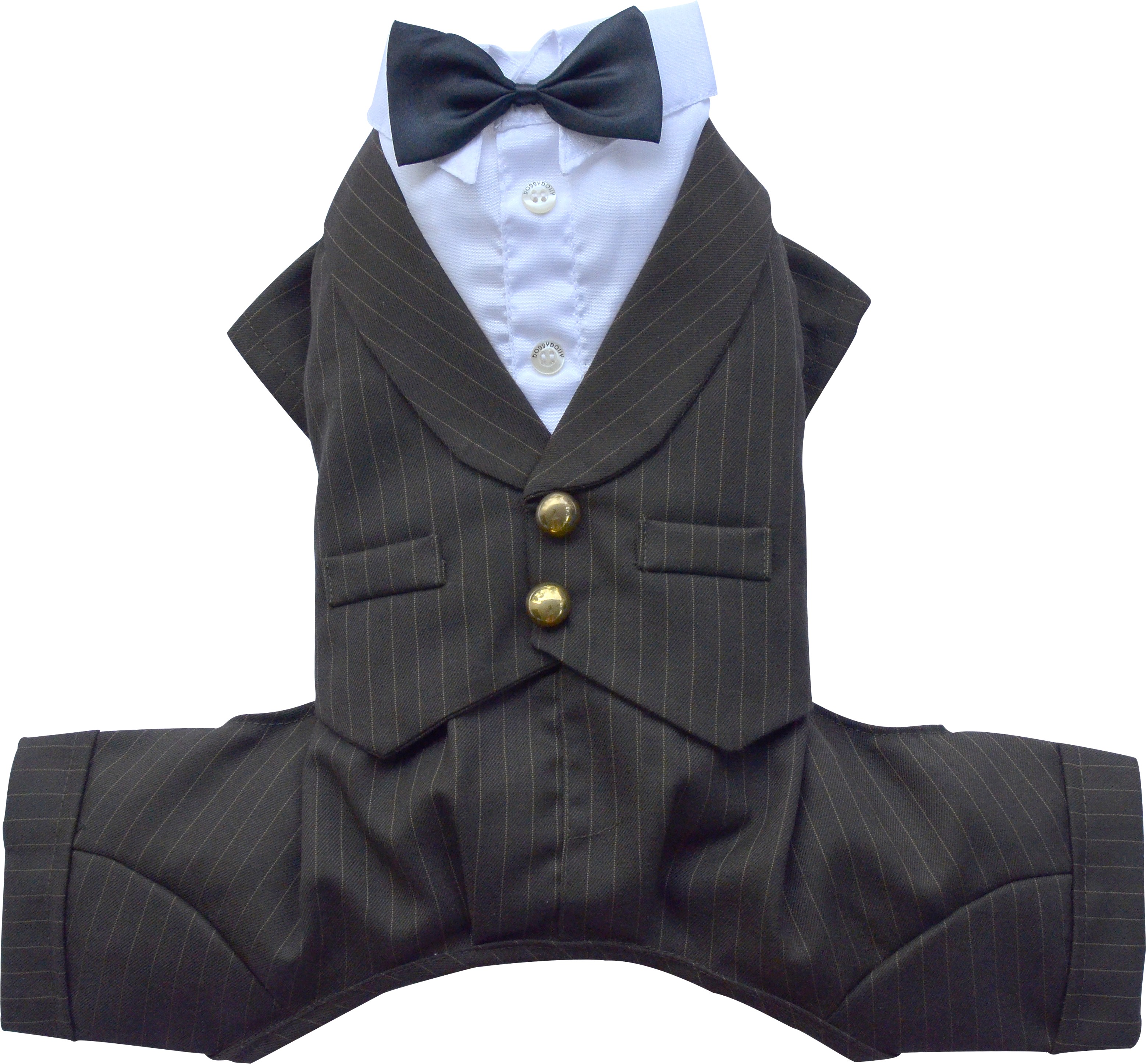 Intramontabile smoking per cani, quattrozampe, marrone gessato con bottoni dorati. Il papillon nero resta sul dorso; la camicia è bianca. Chiusura velcro.