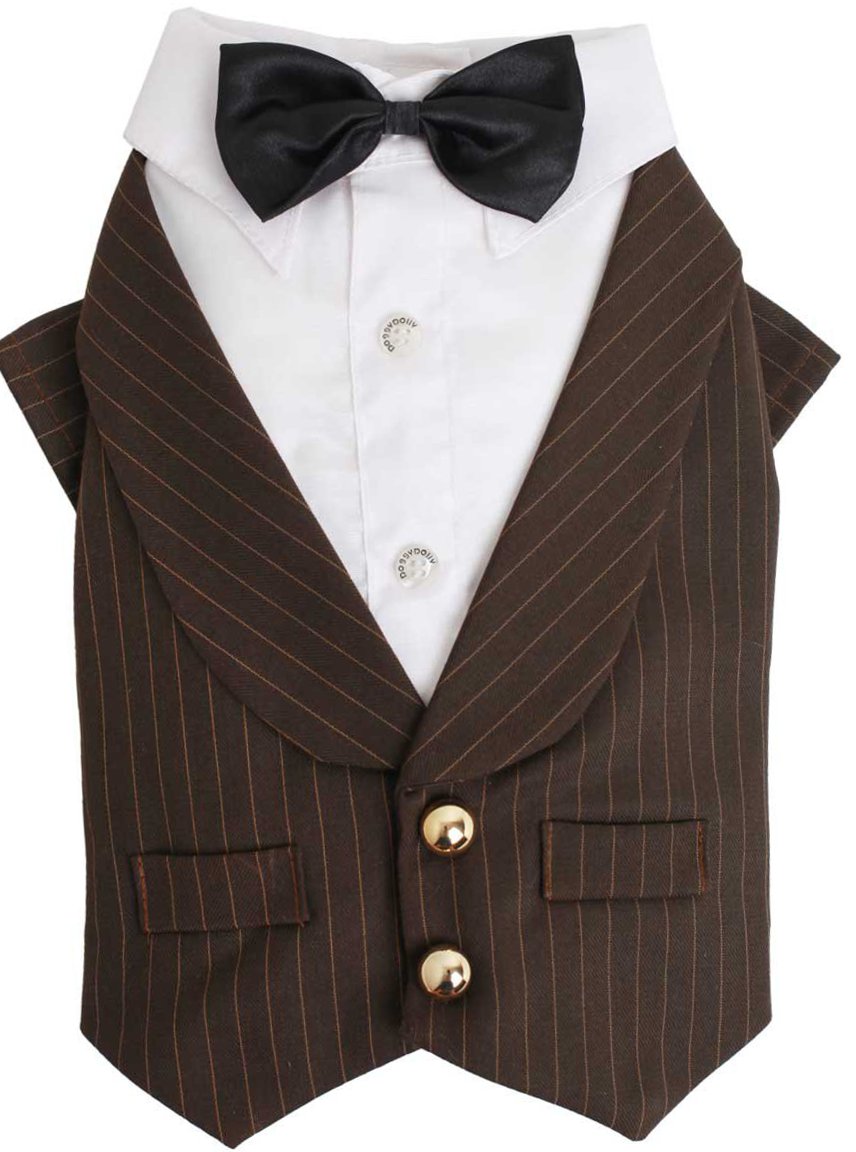 Elegante smoking per cani marrone gessato impreziosito da bottoni dorati. Il papillon nero rimane sulla schiena; la camicia è bianca. Chiusura velcro.