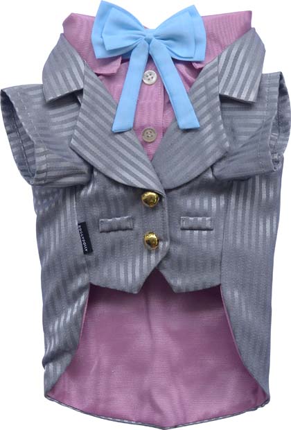 Smoking colorato per un cane alternativo, la giacca grigia in abbinamento alla camicia rosa. Il papillon azzurro rimane sulla gola.