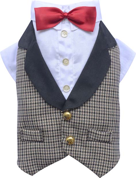 Elegante smoking per cani in 3 colori, impreziosito da bottoni dorati. Il papillon bordeaux rimane sulla schiena in contrasto alla camicia bianca. Chiusura velcro.