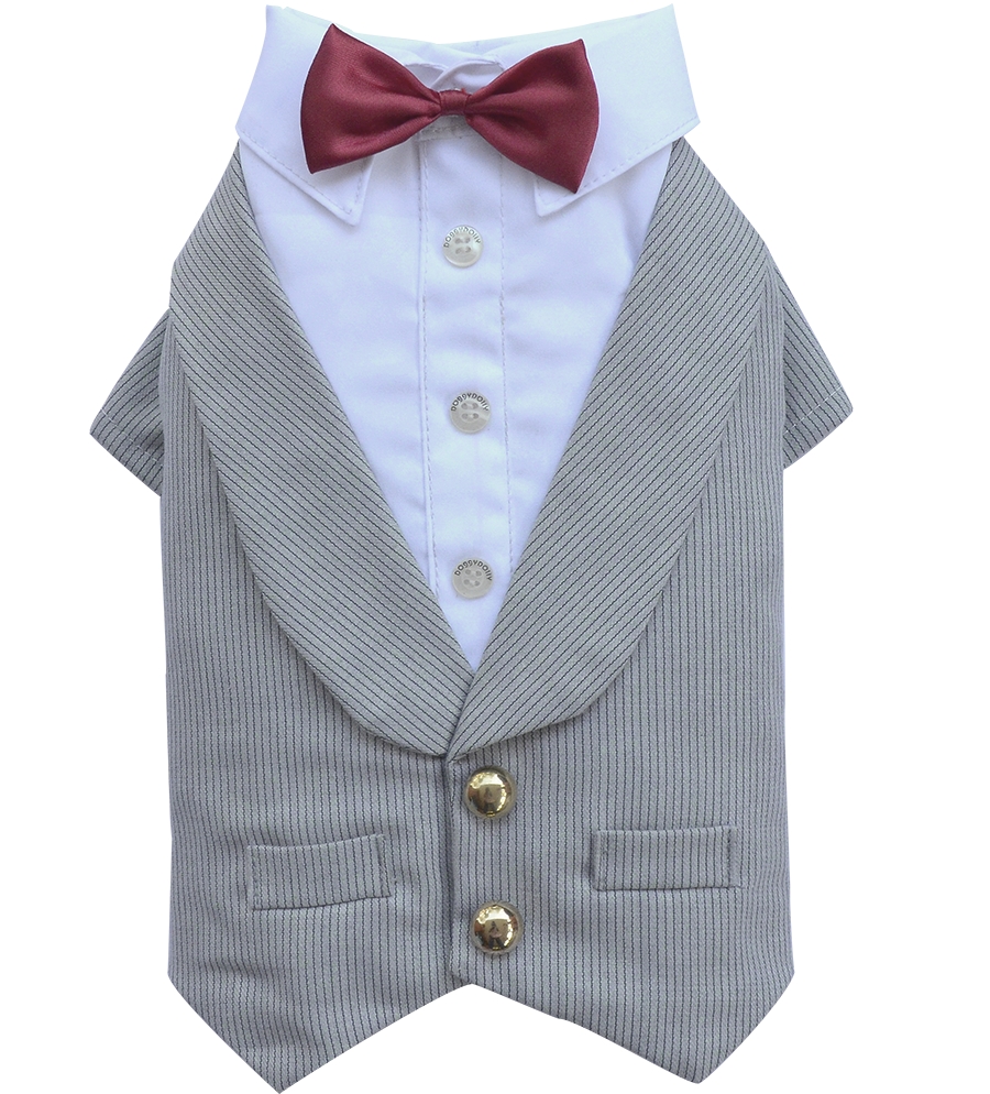 Elegante smoking per cani grigio gessato impreziosito da bottoni dorati. Il papillon rosso rimane sulla schiena; camicia bianca. Chiusura velcro.