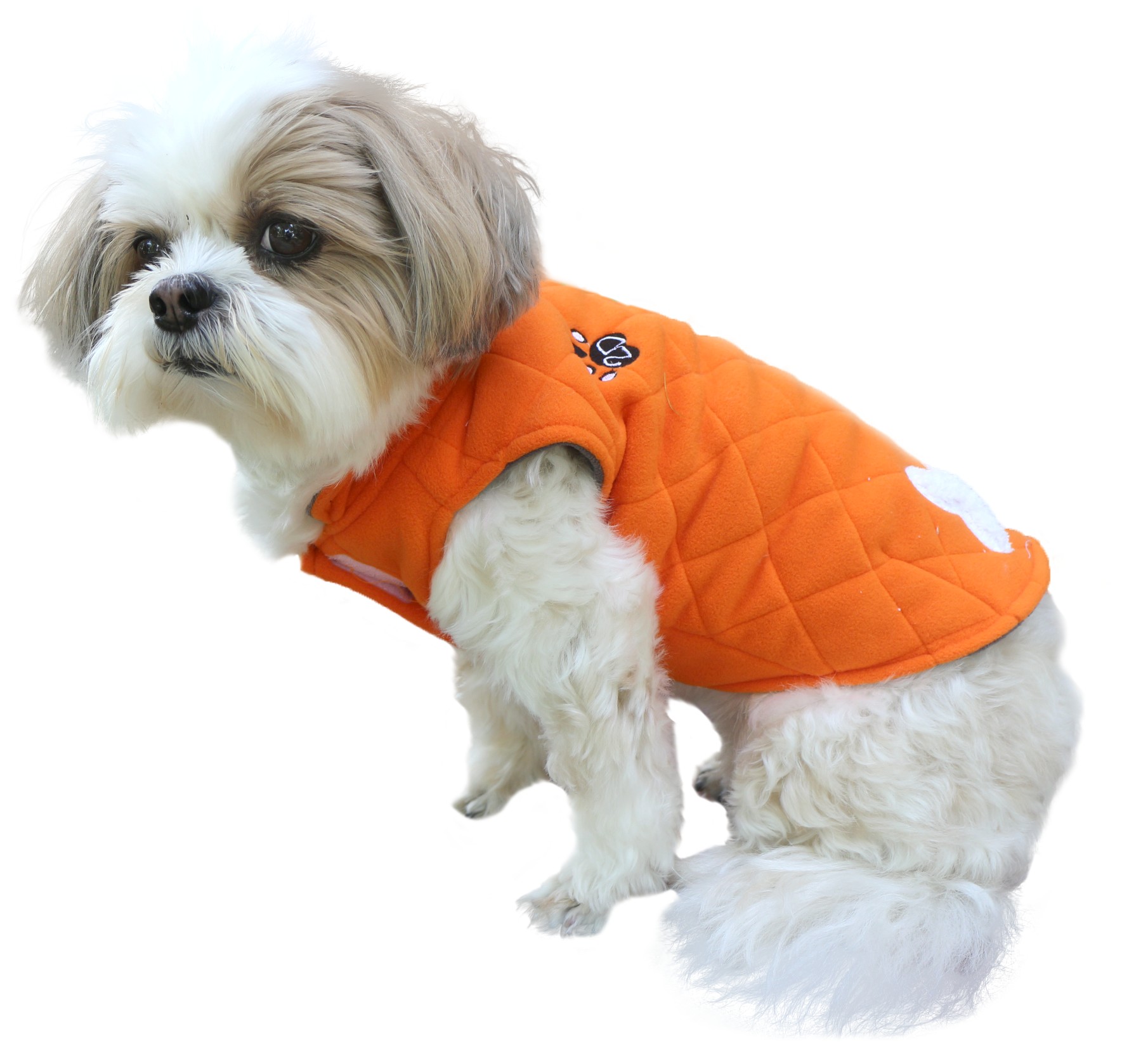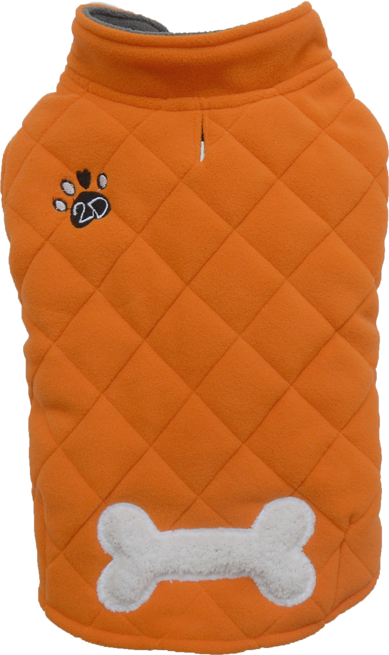 Smanicato per cani in morbido e caldo pile trapuntato ed impreziosito dall'applicazione dell'osso. Chiusura velcro.