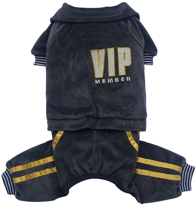 Tuta per cani in ciniglia grigio antracite con bande laterali color oro sulle zampe. Il dorso è impreziosito da un ricamo. Polsini elasticizzati.