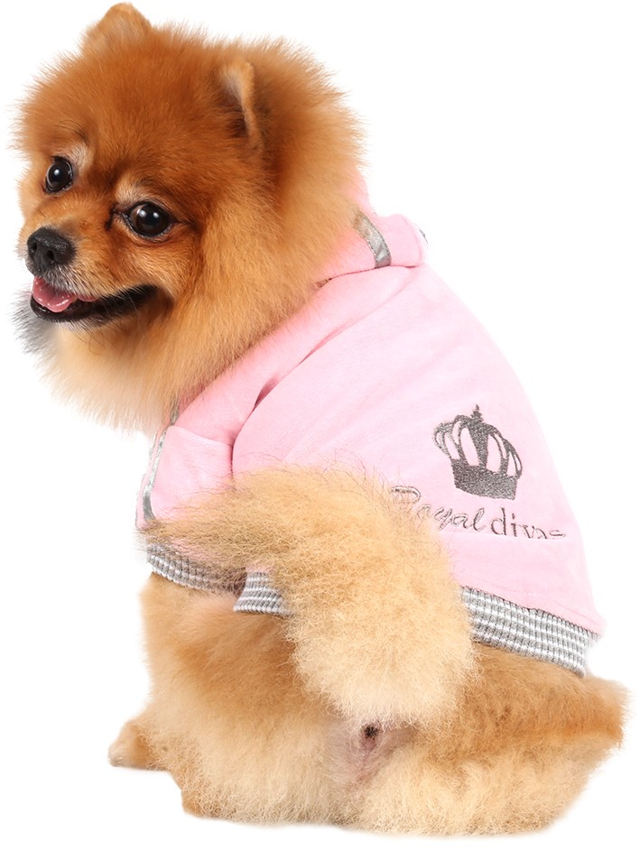 Felpa rosa per cani in ciniglia con cappuccio e bordi elasticizzati. Bande in contrasto color grigio e corona ricamata.
