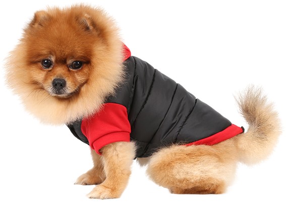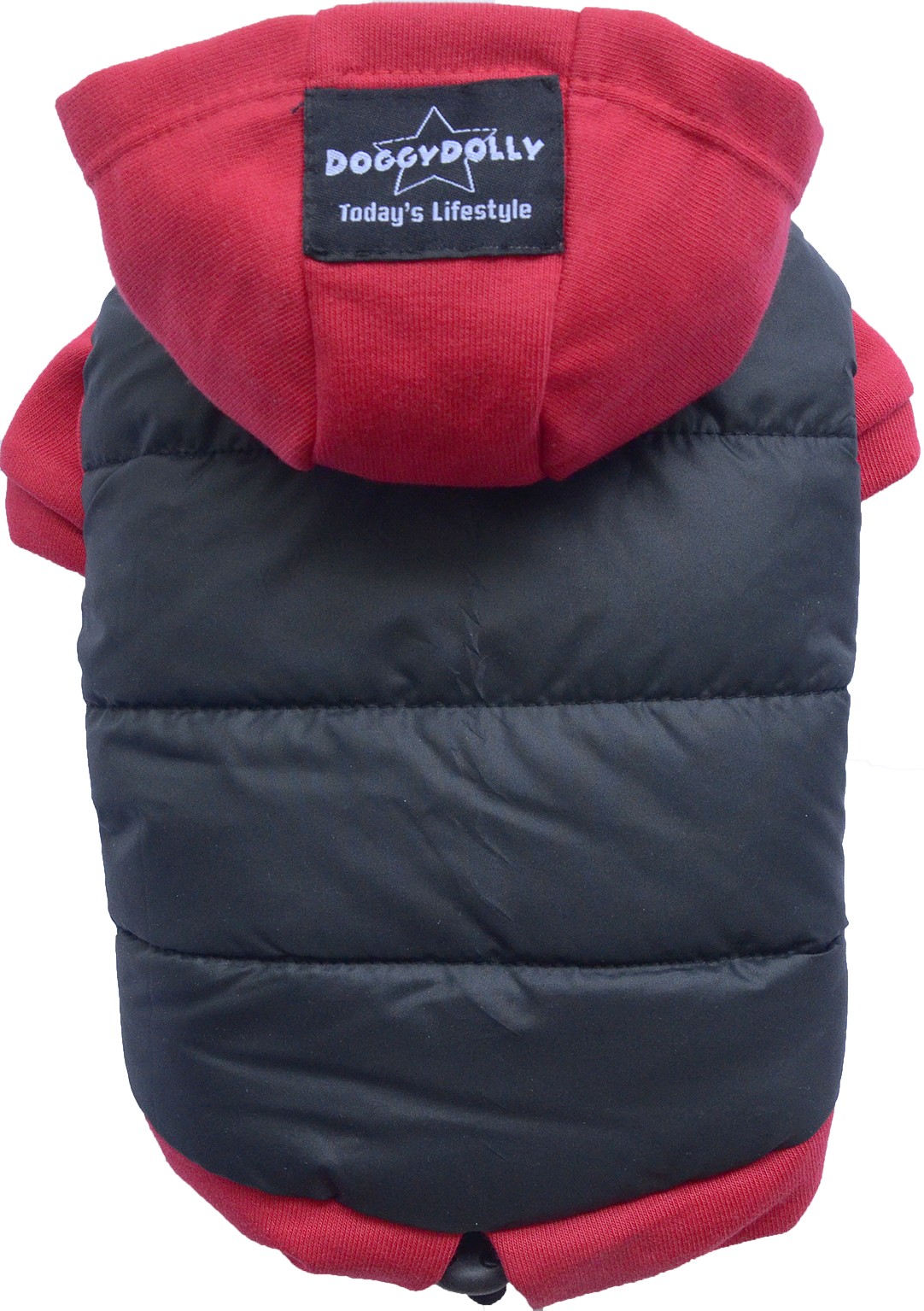 Giubbino per cani imbottito ed impermeabile bicolore. Coulisse regolabile sul fondo, cappuccio e chiusura velcro.