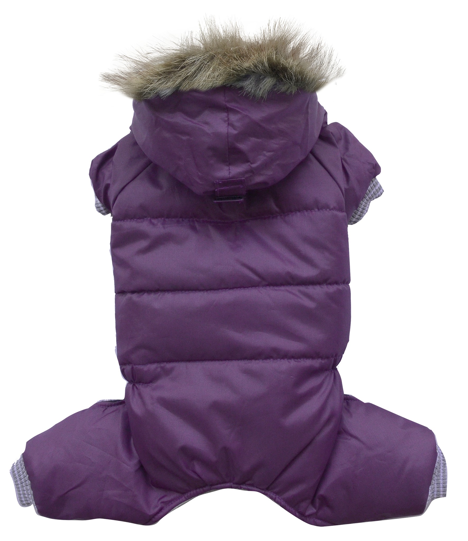 Tuta impermeabile 4 zampe, imbottita, con cappuccio bordato di pelo sintetico internamente foderato in caldo pile. Polsino in maglia. Chiusura con automatici.
