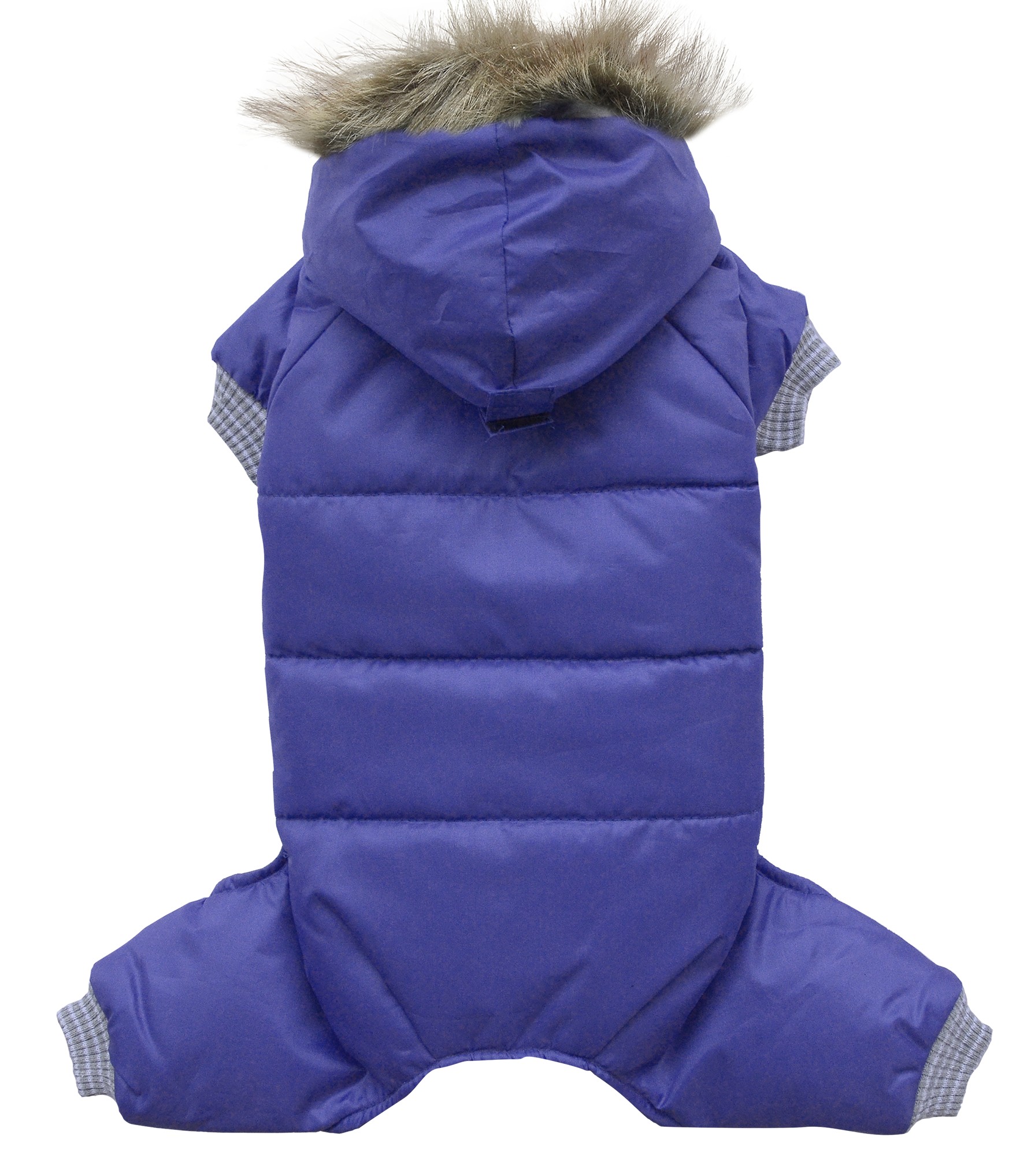 Tuta impermeabile 4 zampe, imbottita, con cappuccio in pelo sintetico internamente foderato in caldo pile. Polsino in maglia. Chiusura con automatici.