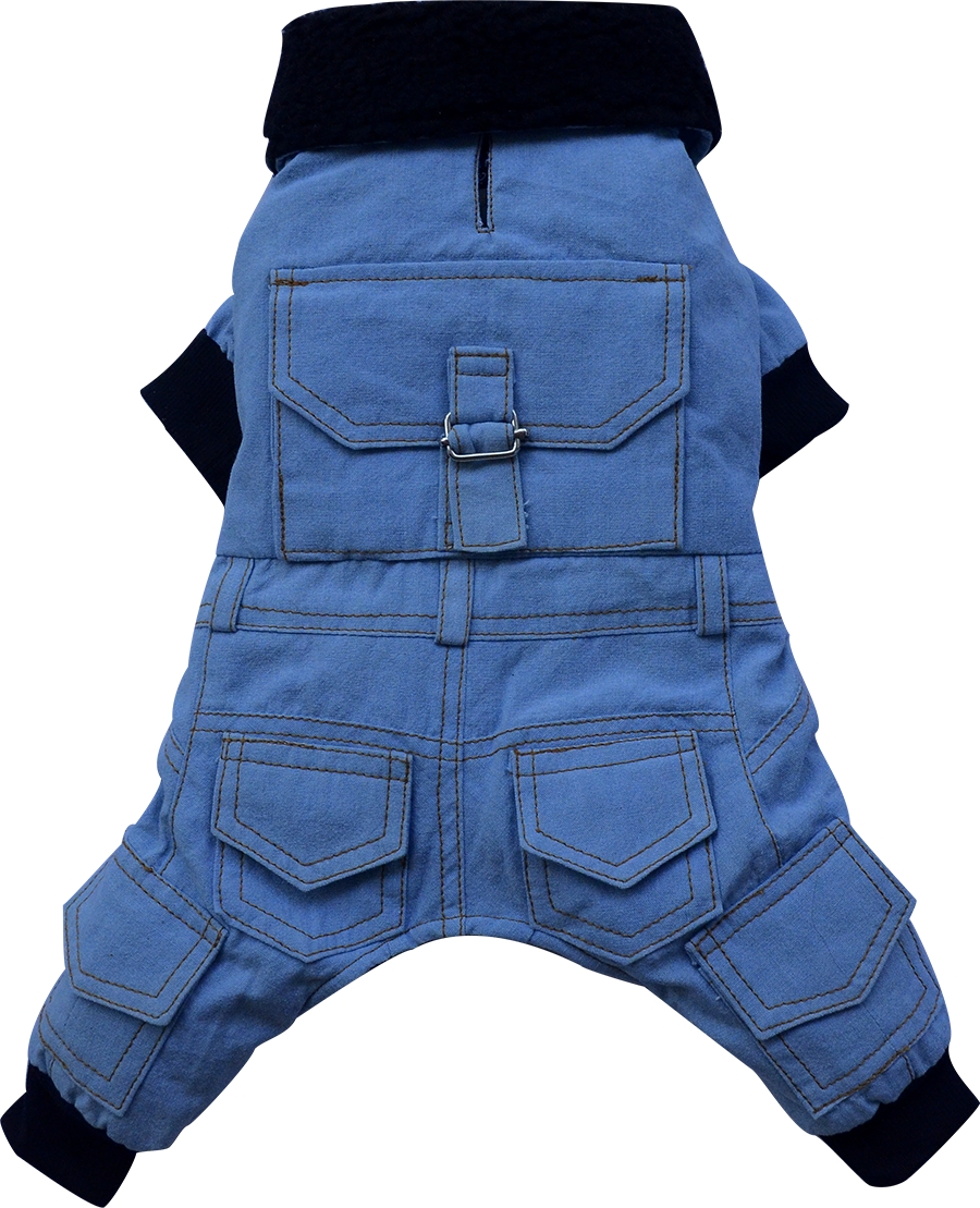 Tuta quattrozampe in jeans scolorito dotata di 5 tasche. Imbottita, polsini elasticizzati, interno in pile e pelo sintetico al collo. Chiusura in velcro.