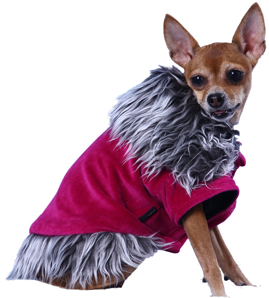 Giubbino per cani in ciniglia color vinaccia, interno caldo pile. Bordato con pelo sintetico. Chiusura in velcro.