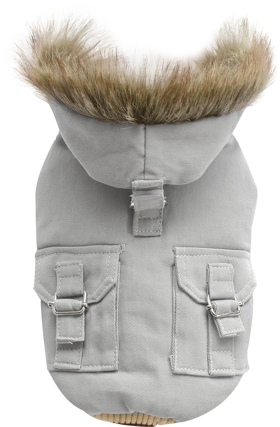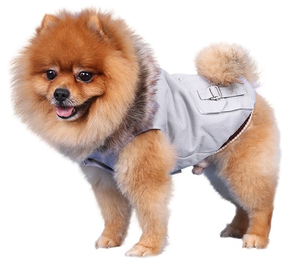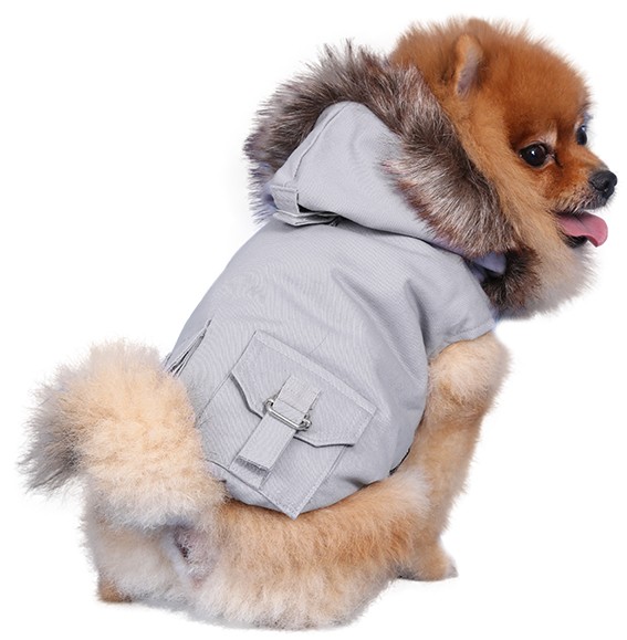 Giubbino per cani in tela di cotone grigia con cappuccio bordato di pelo sintetico. Sul dorso 2 taschine e fermacappuccio. Internamente foderato e chiusura in velcro.