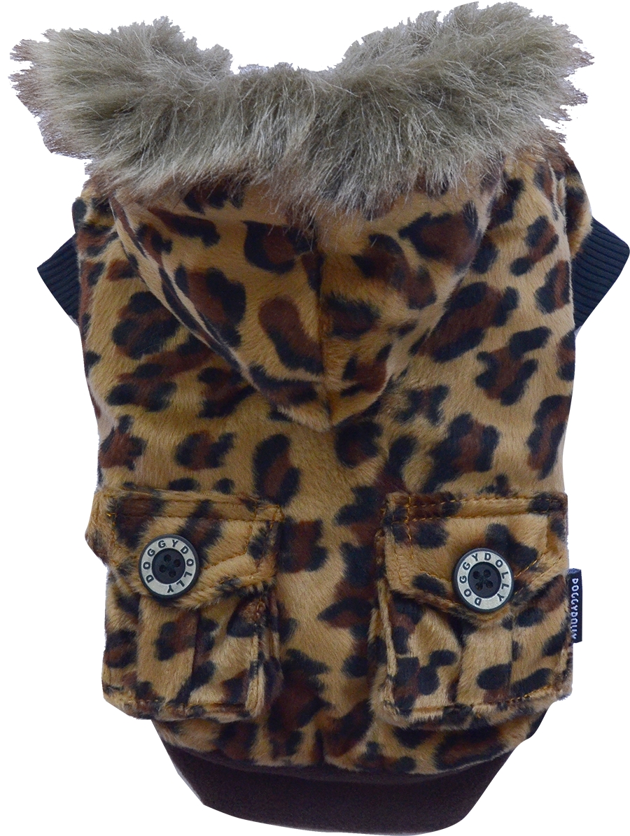 Giubbino per cani leopardato con interno in caldo pile e cappuccio bordato di pelo sintetico. Impreziosito da 2 taschine sul dorso.Chiusura in velcro.