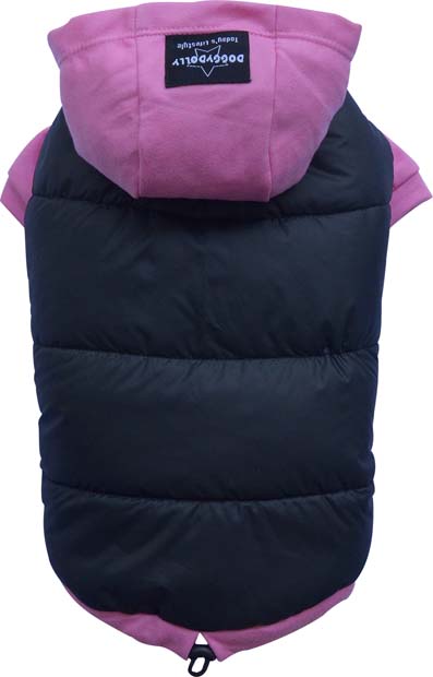 Giubbino per cani imbottito ed impermeabile bicolore. Coulisse regolabile sul fondo, cappuccio e chiusura velcro.