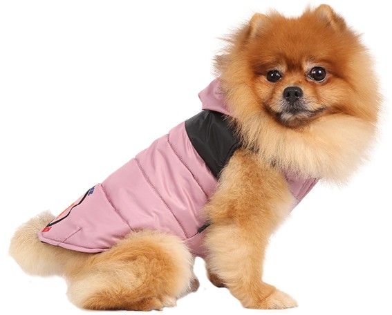Giubbino per cani impermeabile ed imbottito, bicolore rosa e nero. Cappuccio bordato di pelo sintetico e chiusura velcro. Ricamo sul dorso.