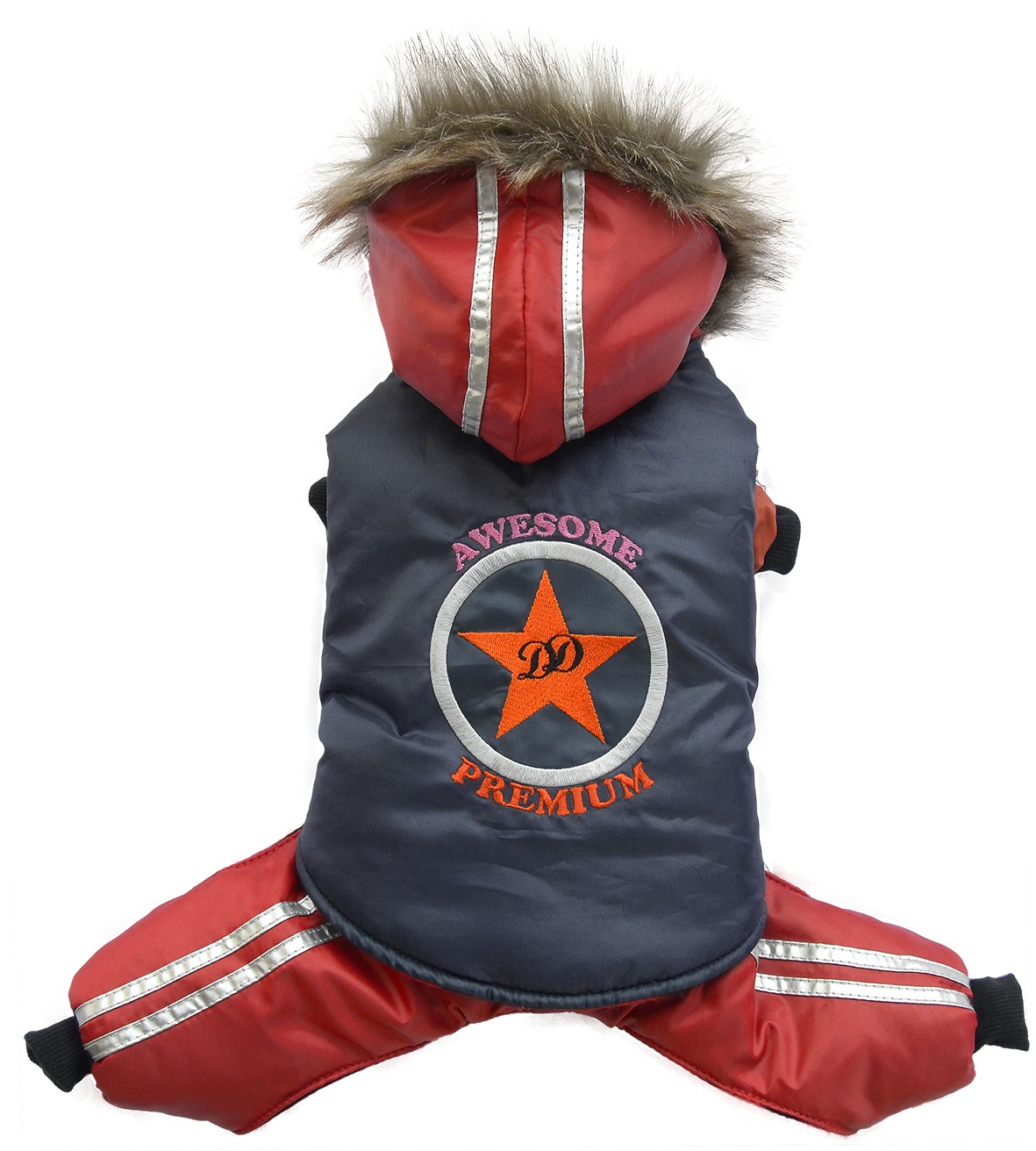 Tuta bicolore imbottita ed impermeabile. Foderata internamente in caldo pile. Cappuccio bordato di pelo e ricamo sul dorso. Chiusura in velcro. Cappuccio e pantaloni staccabili.