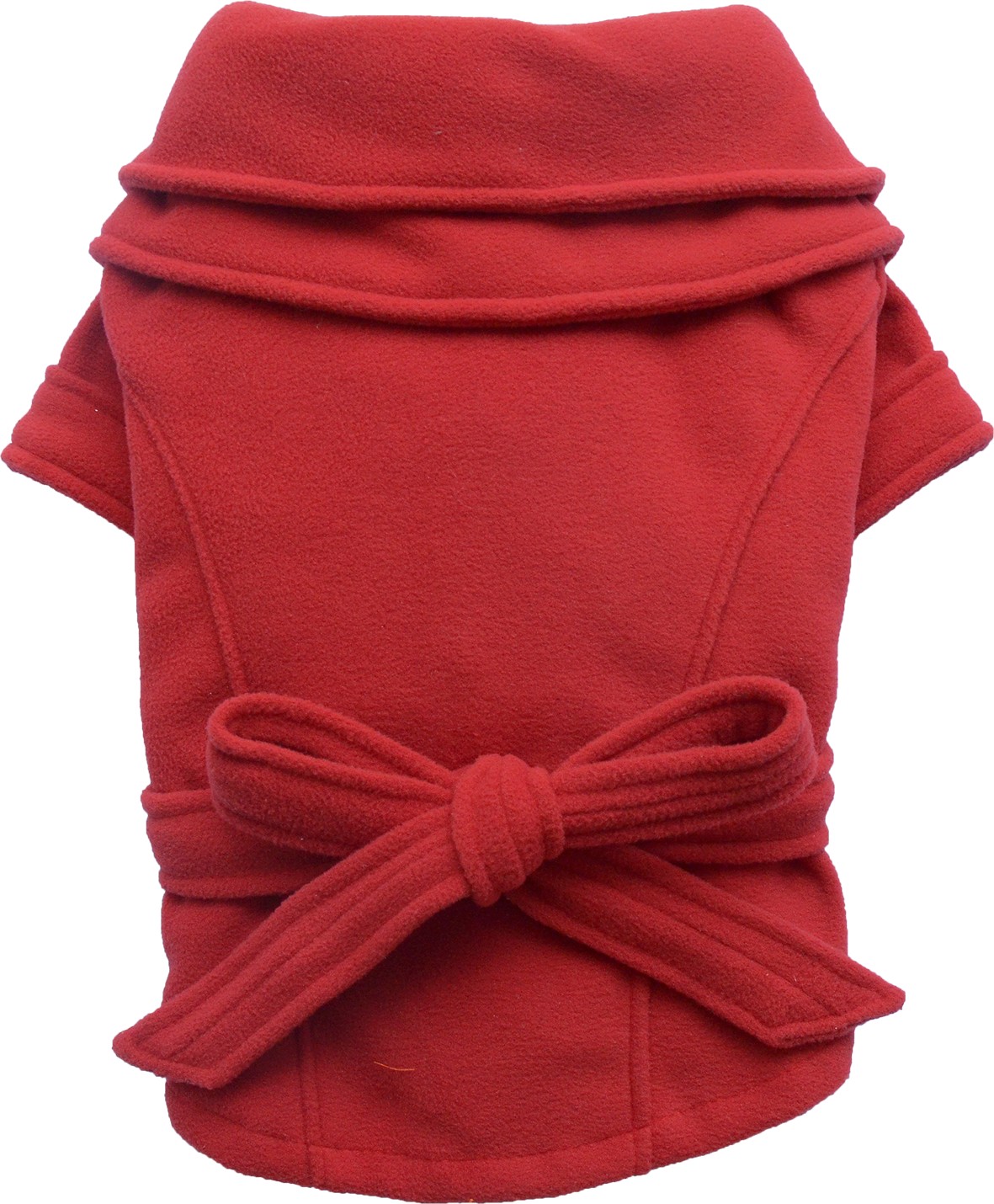 Cappotto per cani in pile rosso con un doppio collo. Cintura avvolgente. Chiusura con bottoni.