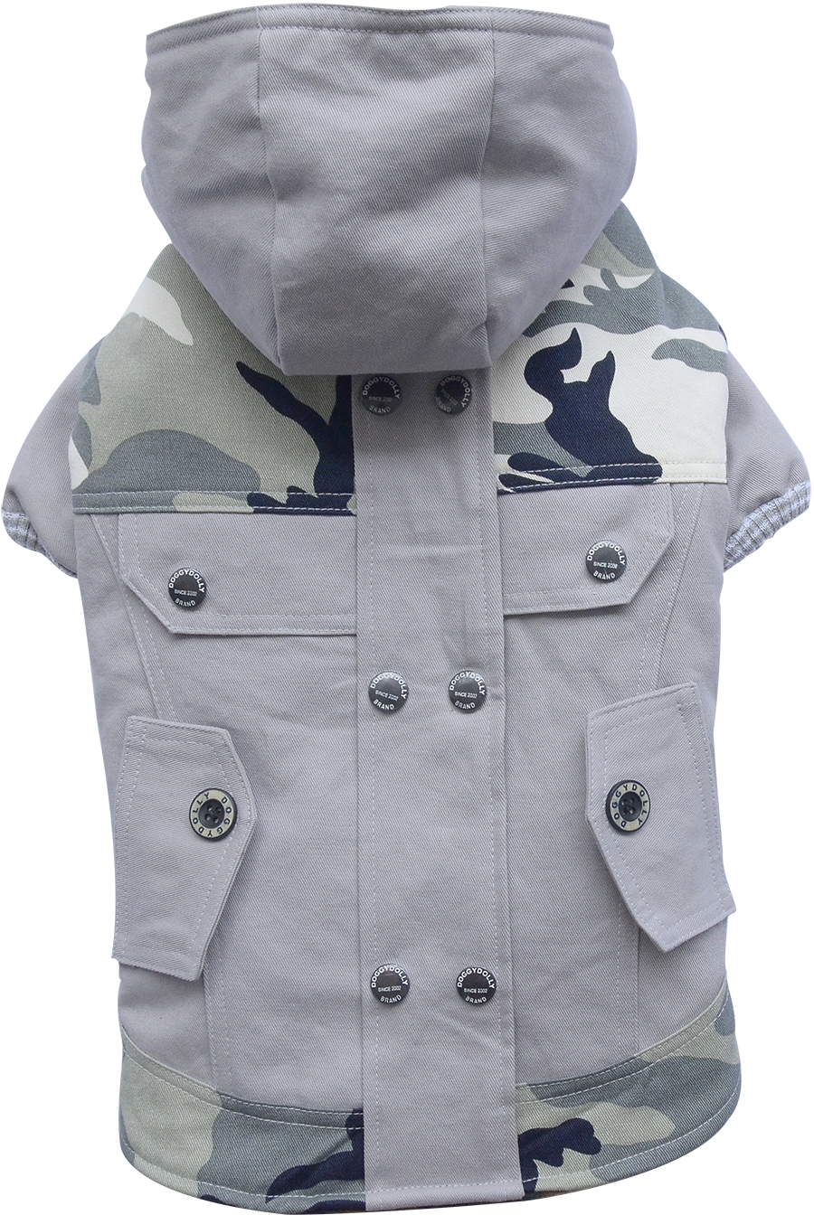 Giubbino mimetico per cani con inserti in tinta unita.Interno in caldo pile. Cappuccio staccabile.Chiusura con bottoni.