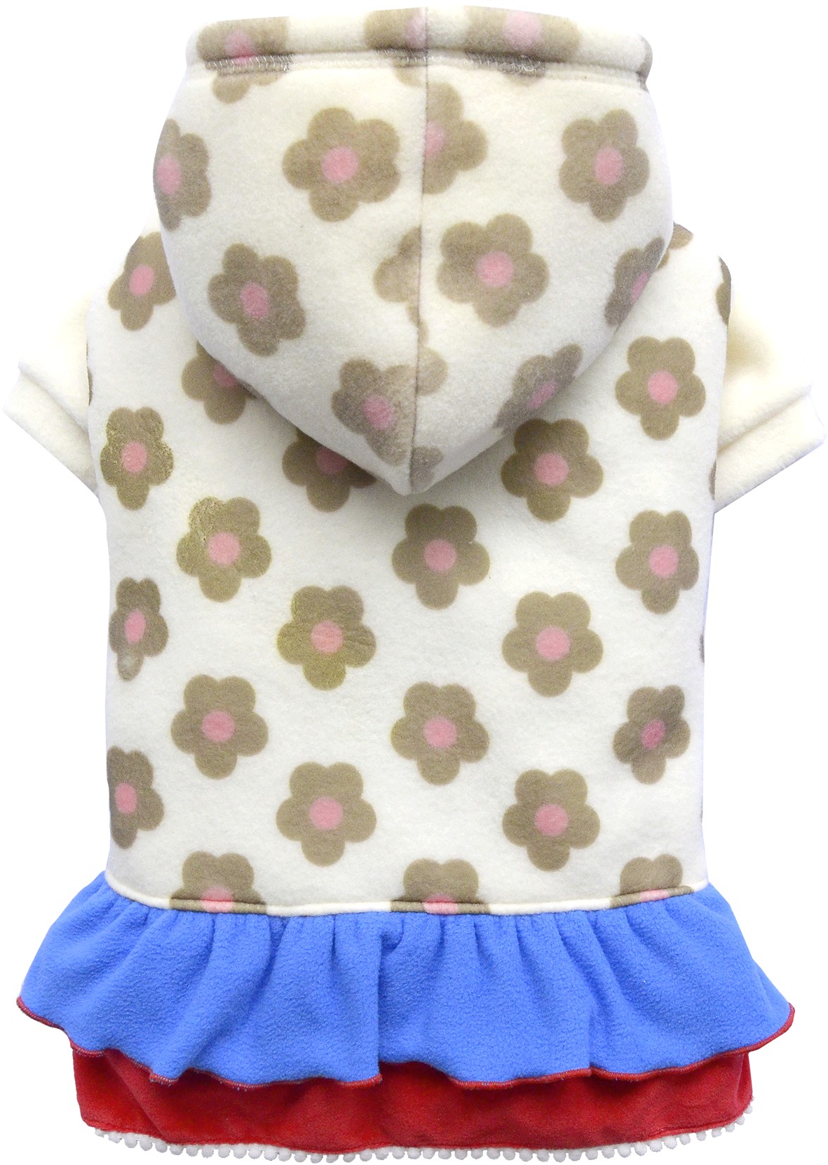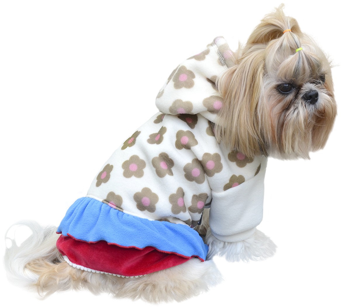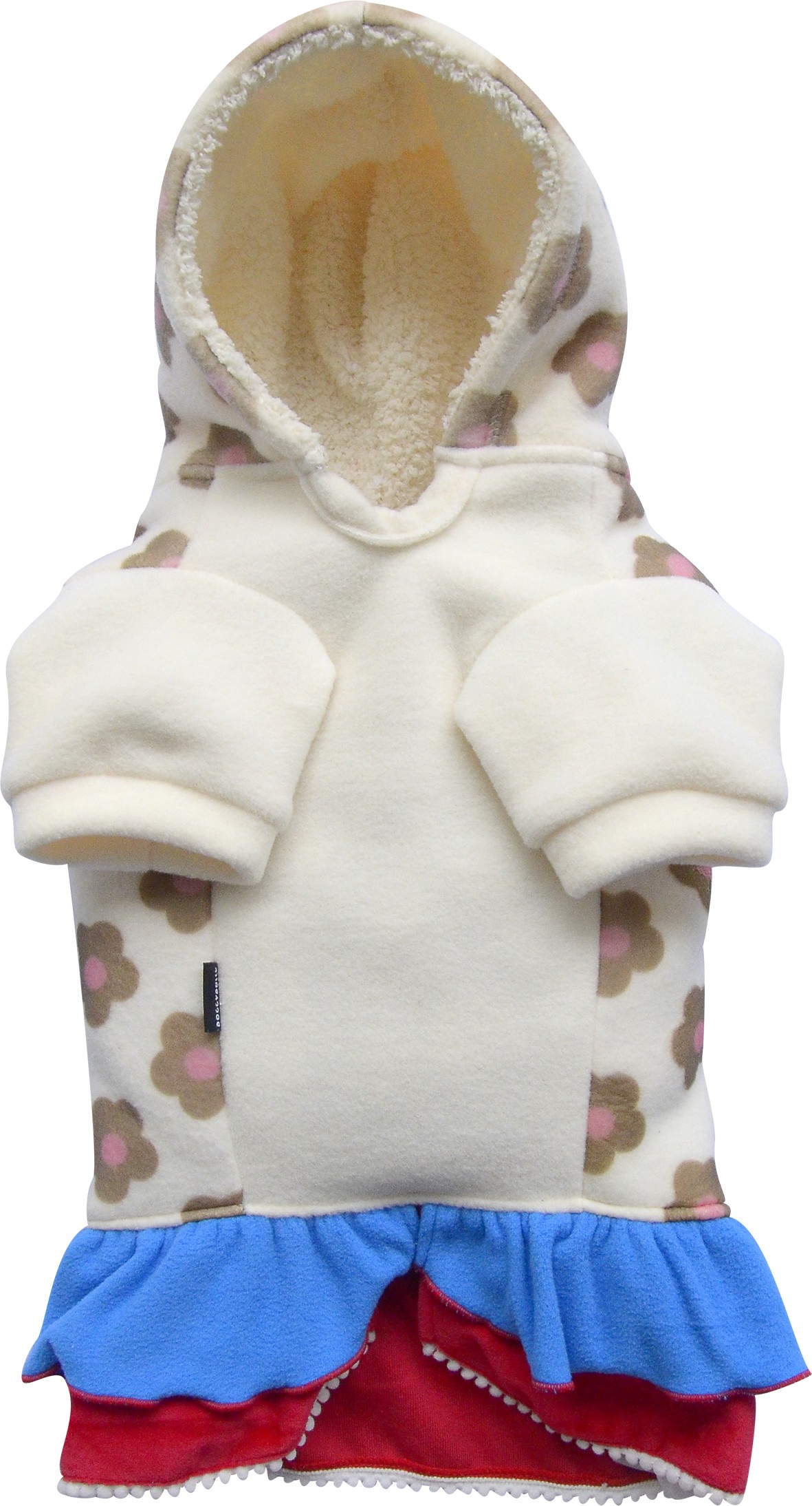Vestito per cani in caldo pile con cappuccio e gonna con volant rosso e bluette.