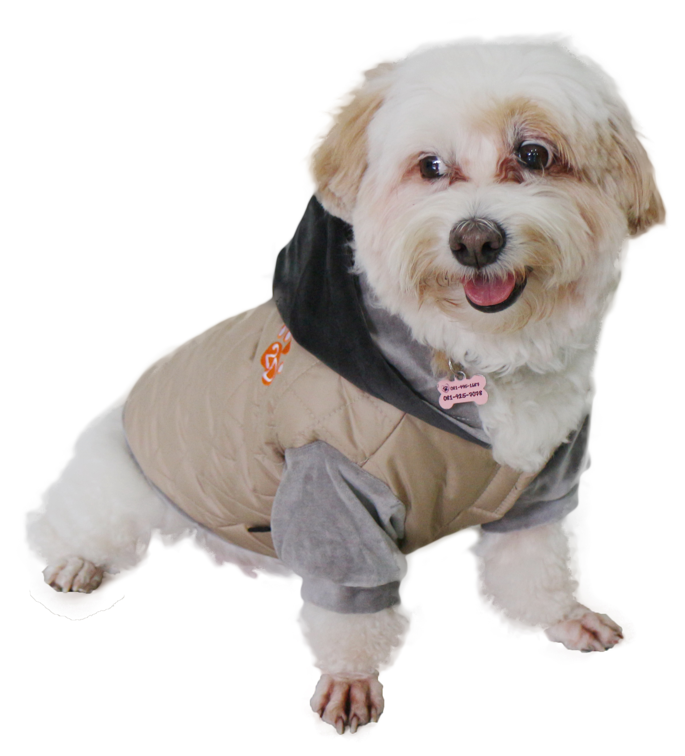 Giubbino imbottito per cani beige e nero con cappuccio in ciniglia e coulisse regolabile in vita. Chiusura velcro.
