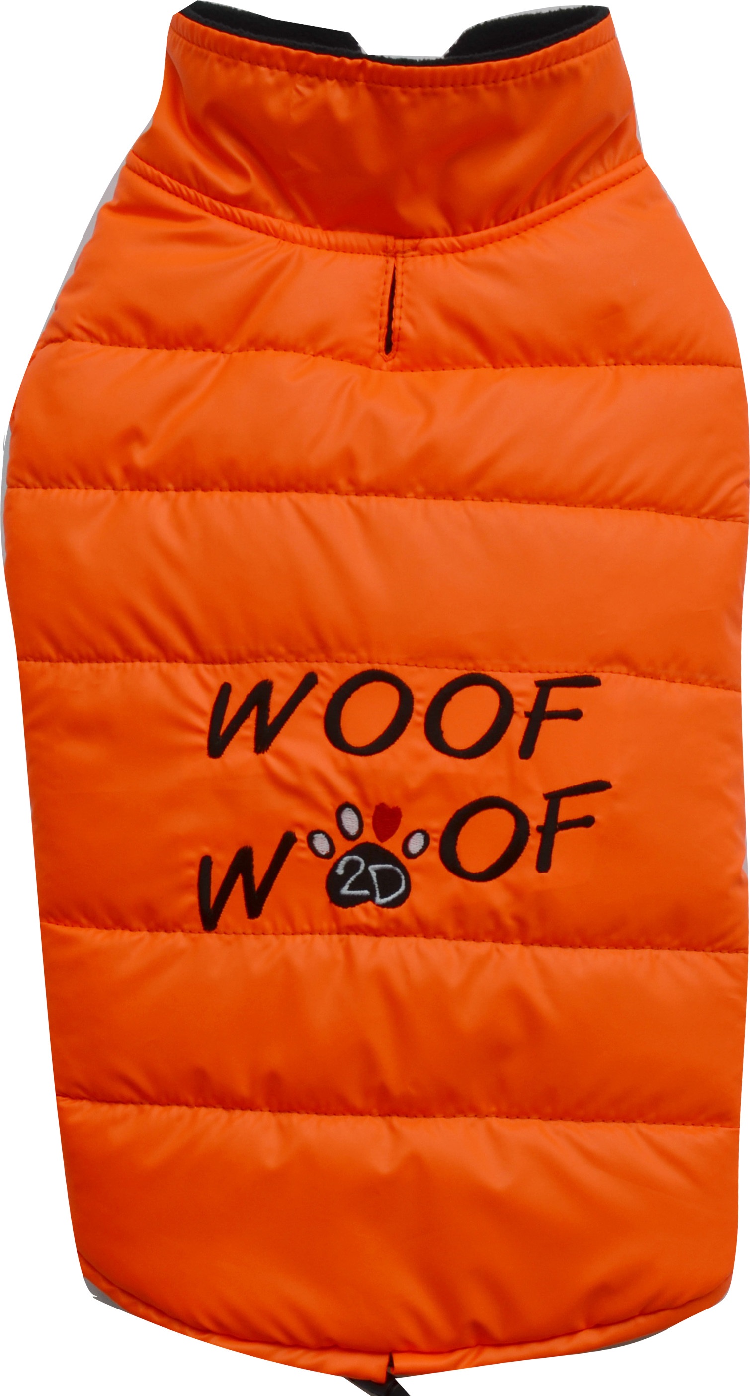 Smanicato, imbottito ed impermeabile. Interno colore contrasto in pile. Coulisse regolabile sul fondo e chiusura velcro. Ricamo WOOF WOOF con zampetta.