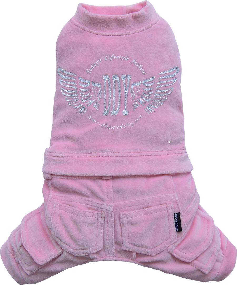 Confortevole tuta quattrozampe per cani sportivi e non solo . . . In ciniglia rosa con stampa glitterata sul dorso; arricchita da quattro simpatiche taschine.