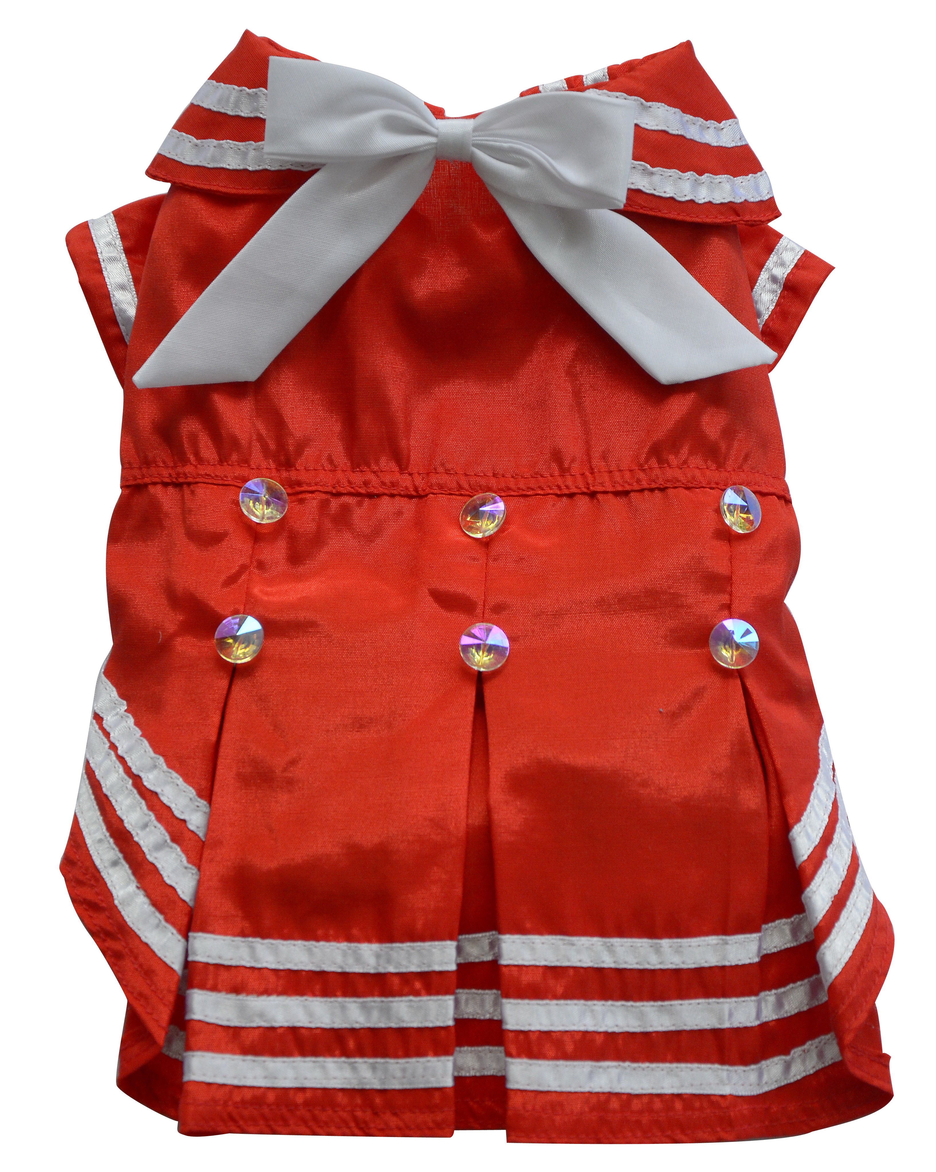 Vestitino per cani taglie speciali, stile marinaro in raso rosso con grande fiocco e bande laterali in contrasto. Chiusura velcro.