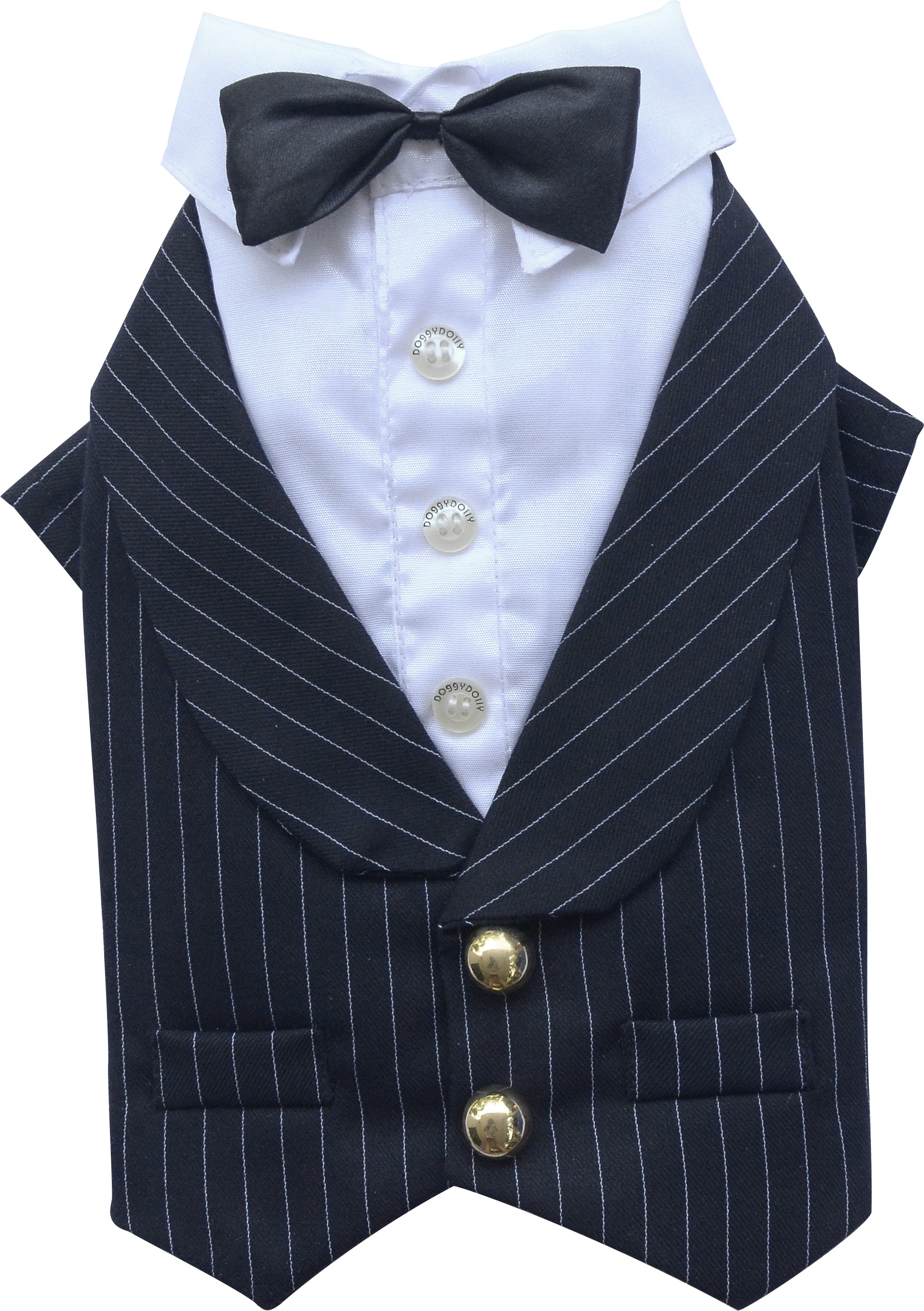 Elegante smoking per cani taglie speciali nero gessato impreziosito da bottoni dorati. Il papillon nero rimane sulla schiena in contrasto alla camicia bianca. Chiusura velcro.