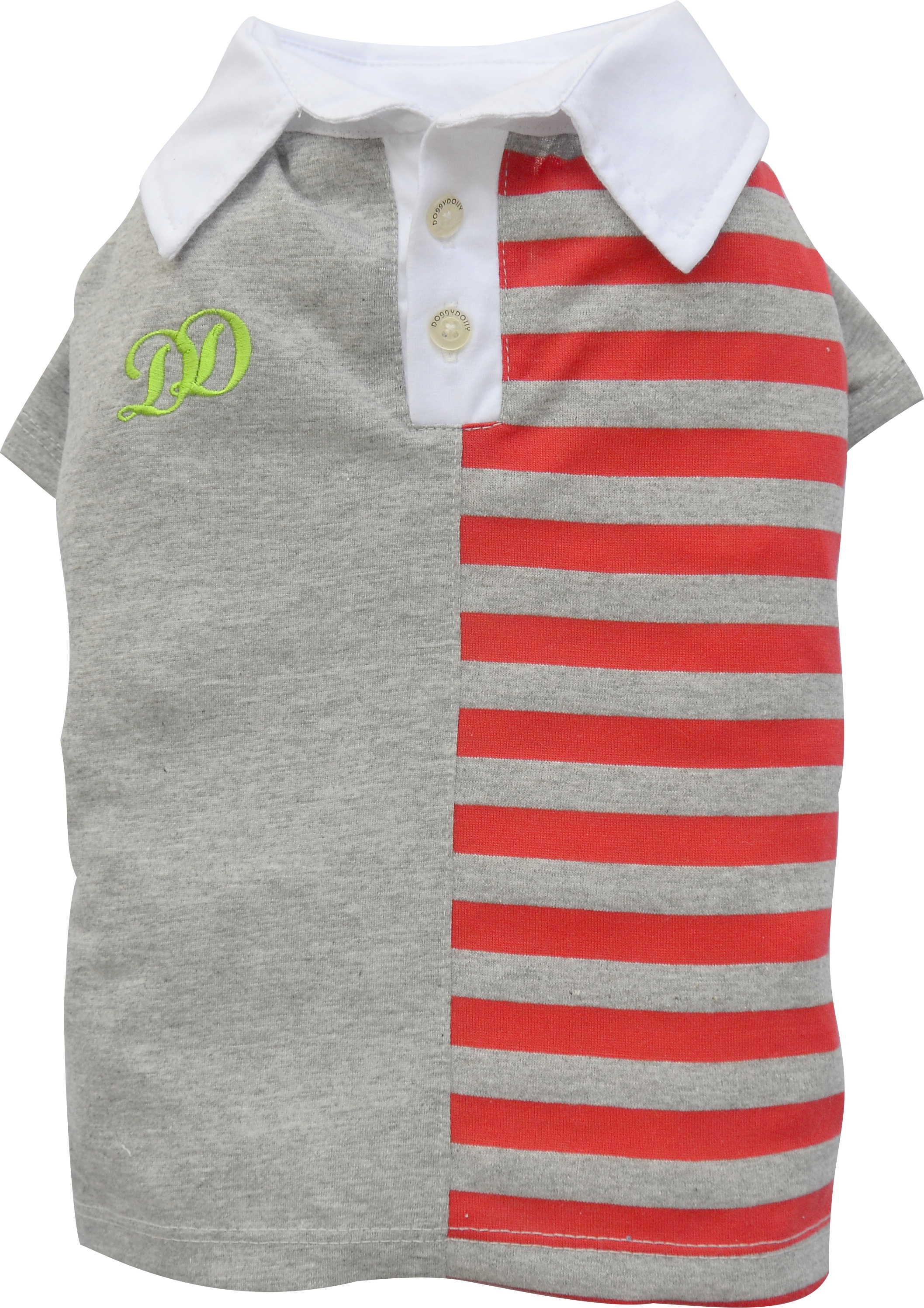 Polo per cani taglie speciali in cotone grigio con righe rosse e colletto bianco. Logo DD ricamato e bottoncini.