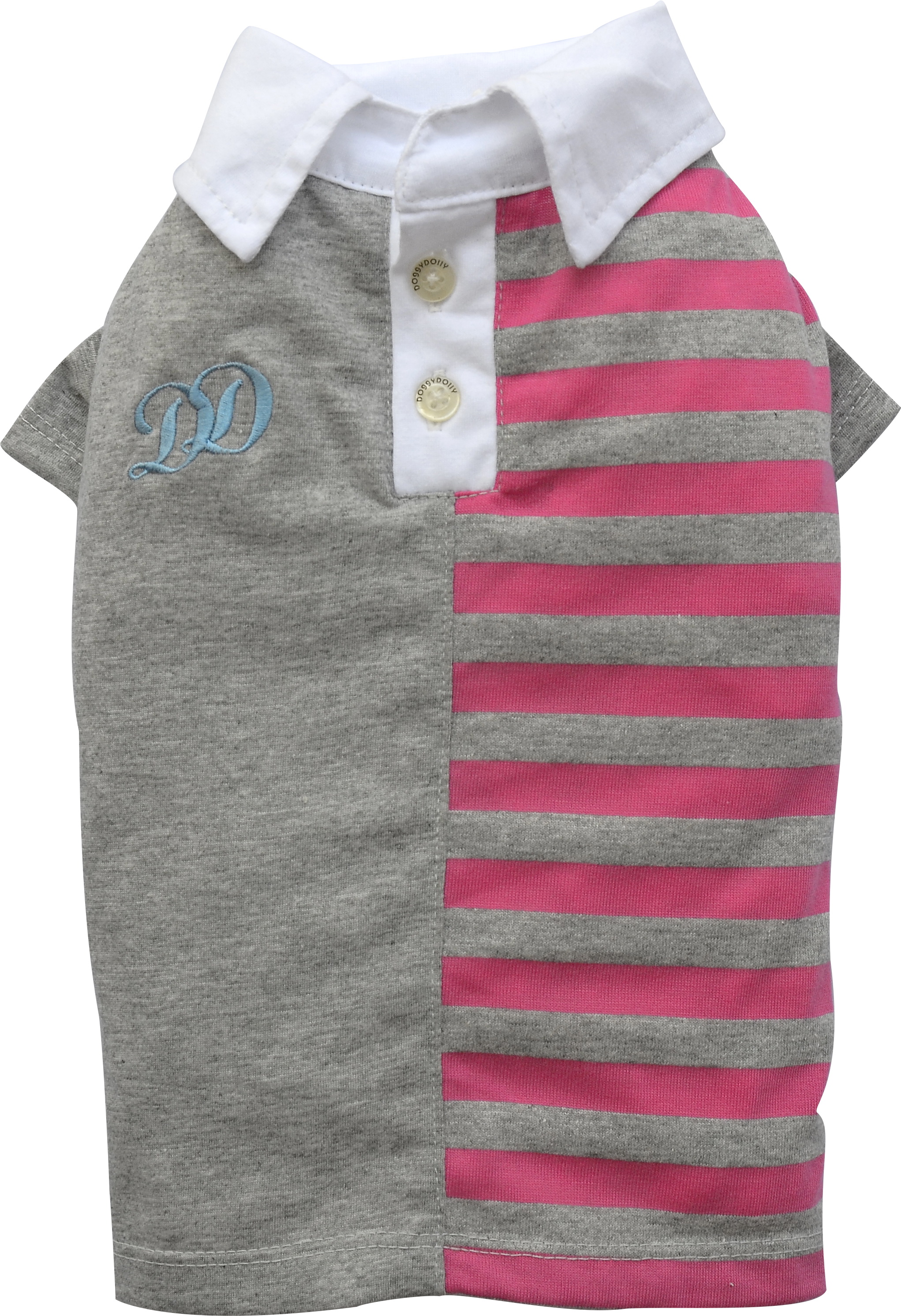 Polo per cani taglie speciali in cotone grigio con righe fucsia e colletto bianco. Logo DD ricamato e bottoncini.
