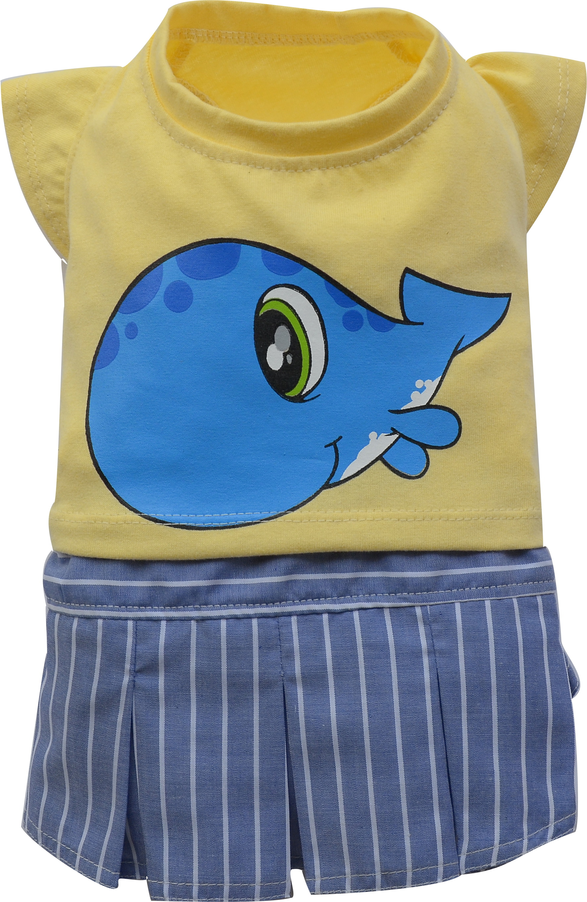 Simpatico vestitino per cani taglie speciali con gonna a pieghe abbinata a t-shirt in tinta unita gialla con grande pesce stampato.