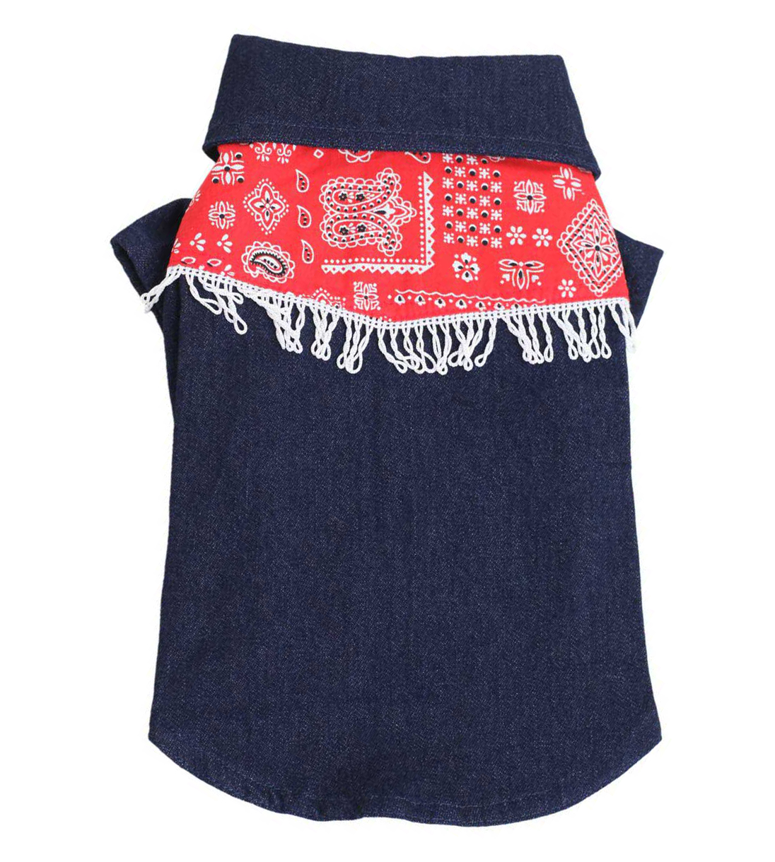 Giubbino per cani stile cow-boy, in jeans, con inserto in fantasia e frange. Chiusura velcro.