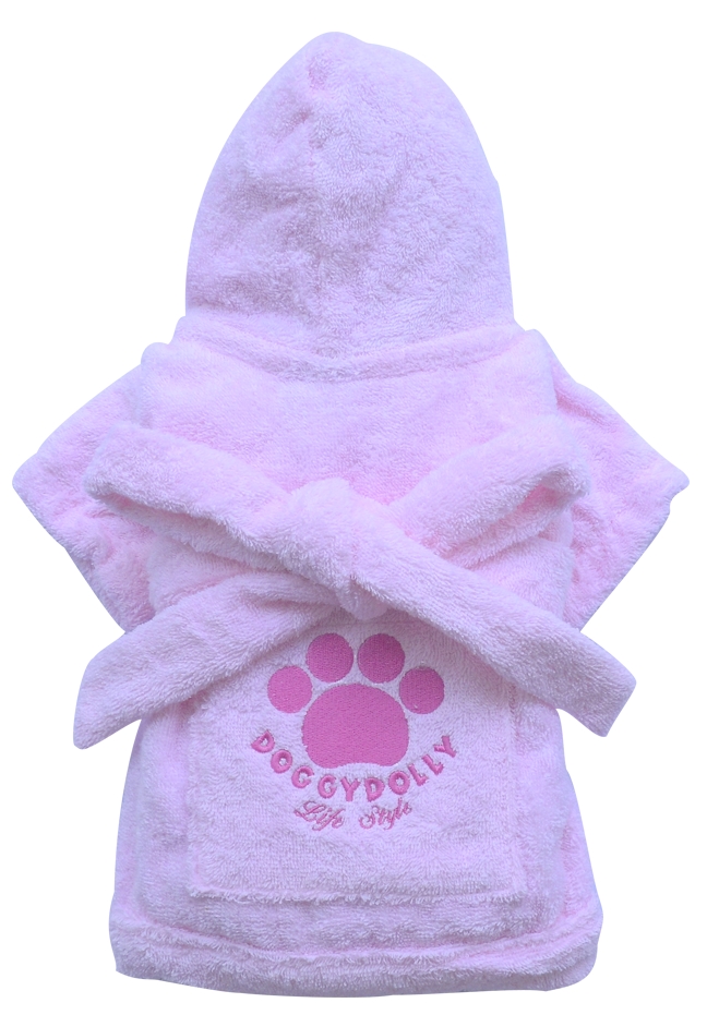 Avvolgente accappatoio per cani in morbida spugna rosa. Taschina con logo e impronta zampa ricamati. Per lei.