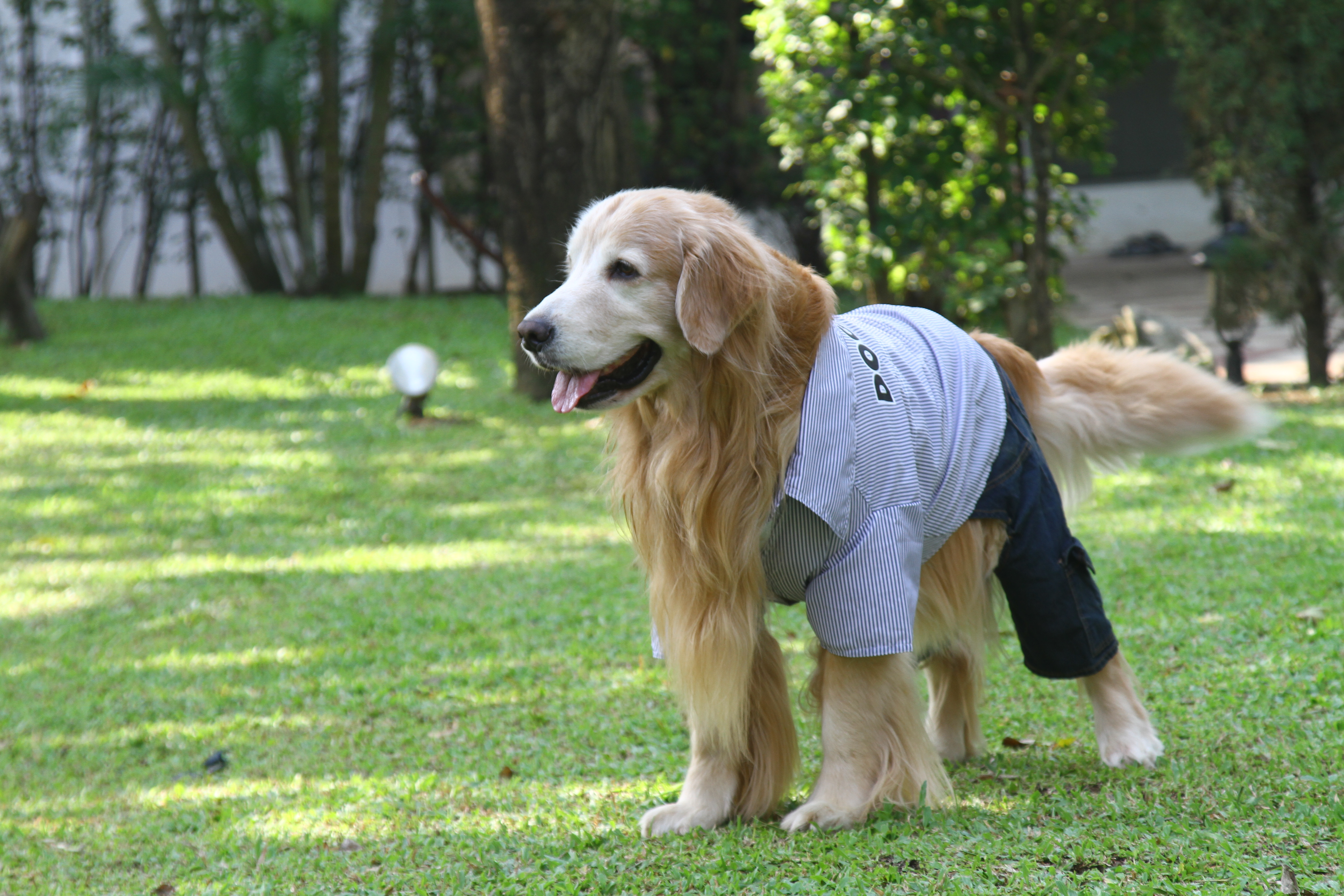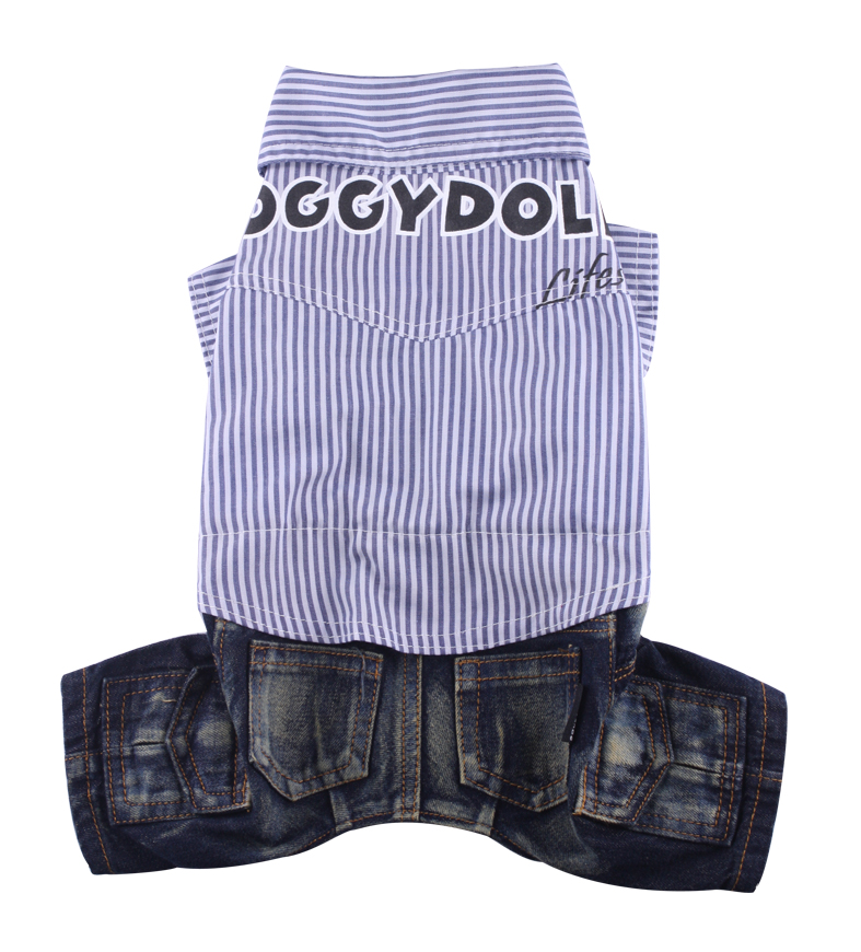 Jeans per cani delavé con 4 tasche, abbinati a camicia in fantasia arricchita da logo stampato.