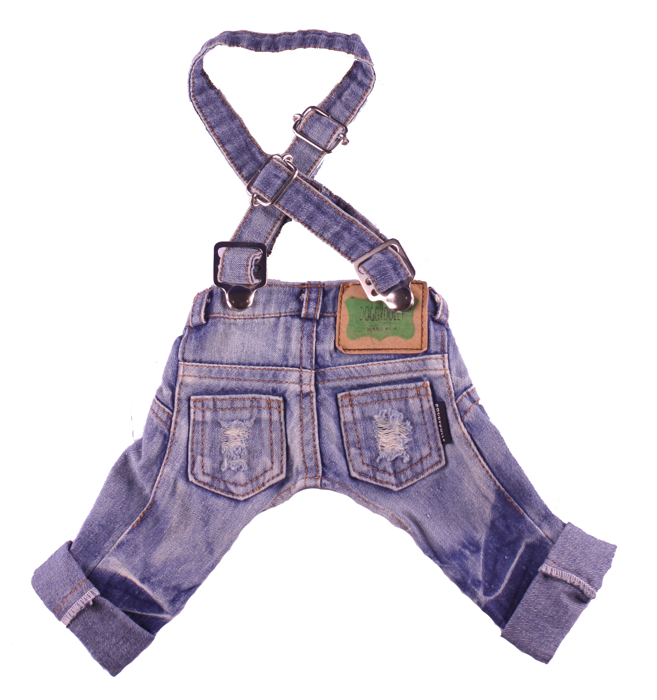 Jeans per cani ad effetto slavato con simpatiche bretelle. Applicazione di taschine strappate, regolabili in vita con velcro.