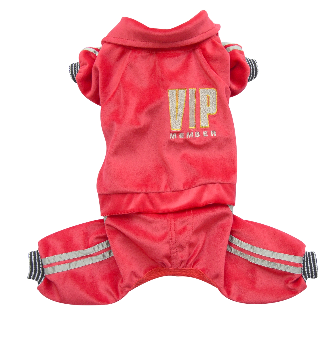 Tuta per cani in ciniglia con bande laterali sulle zampe. Scritta ricamata sul dorso e polsini elasticizzati.