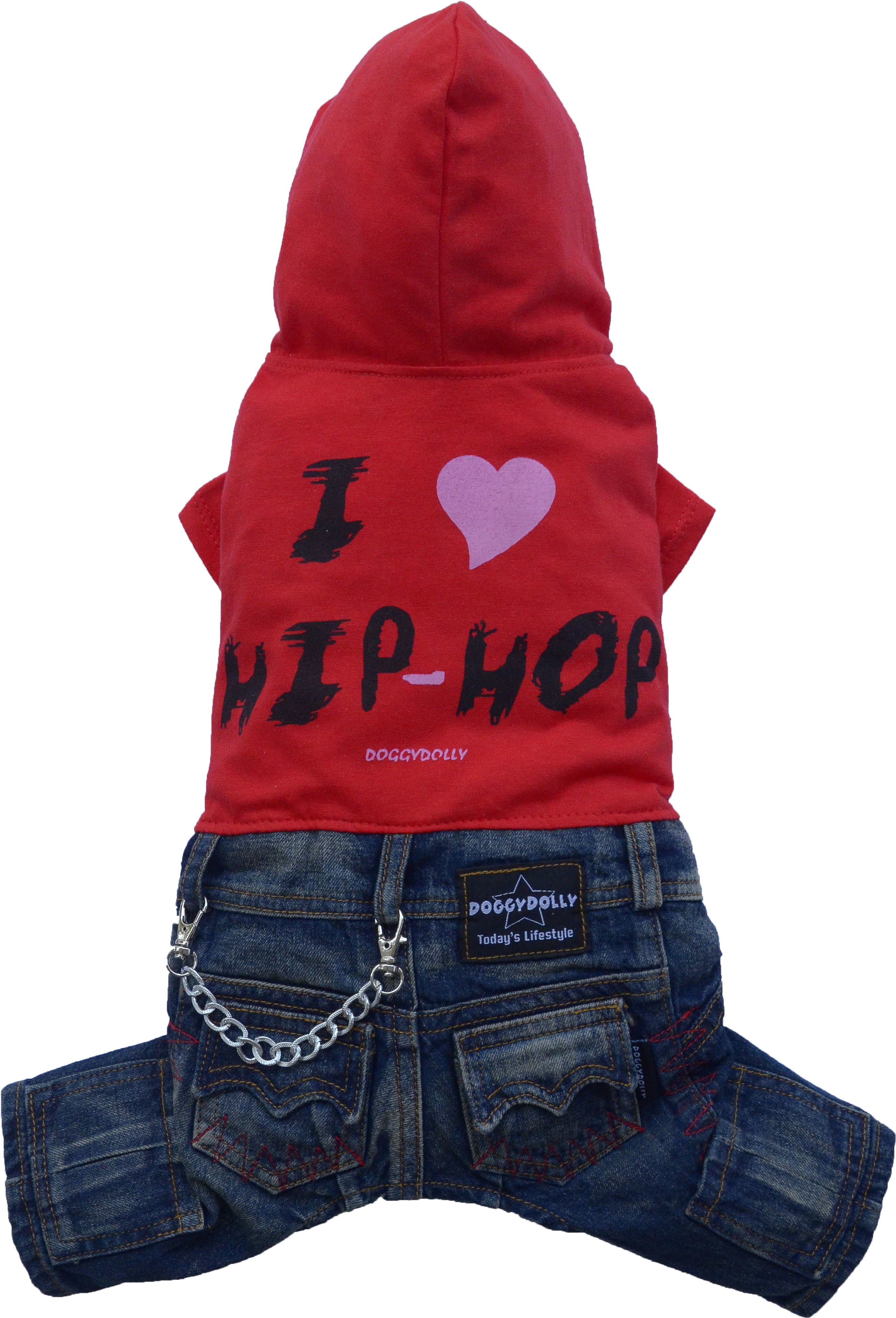 Jeans per can idelavé con 4 tasche, abbinati a t-shirt con stampa. Catena stile Hip-Hop e cappuccio.