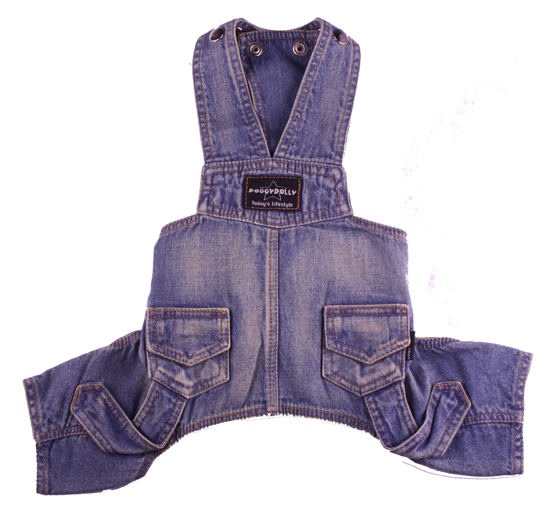 Classica salopette in jeans slavato con 2 tasche. Per cani taglie speciali (carlino, french bulldog e simili). Regolabile in larghezza e lunghezza.