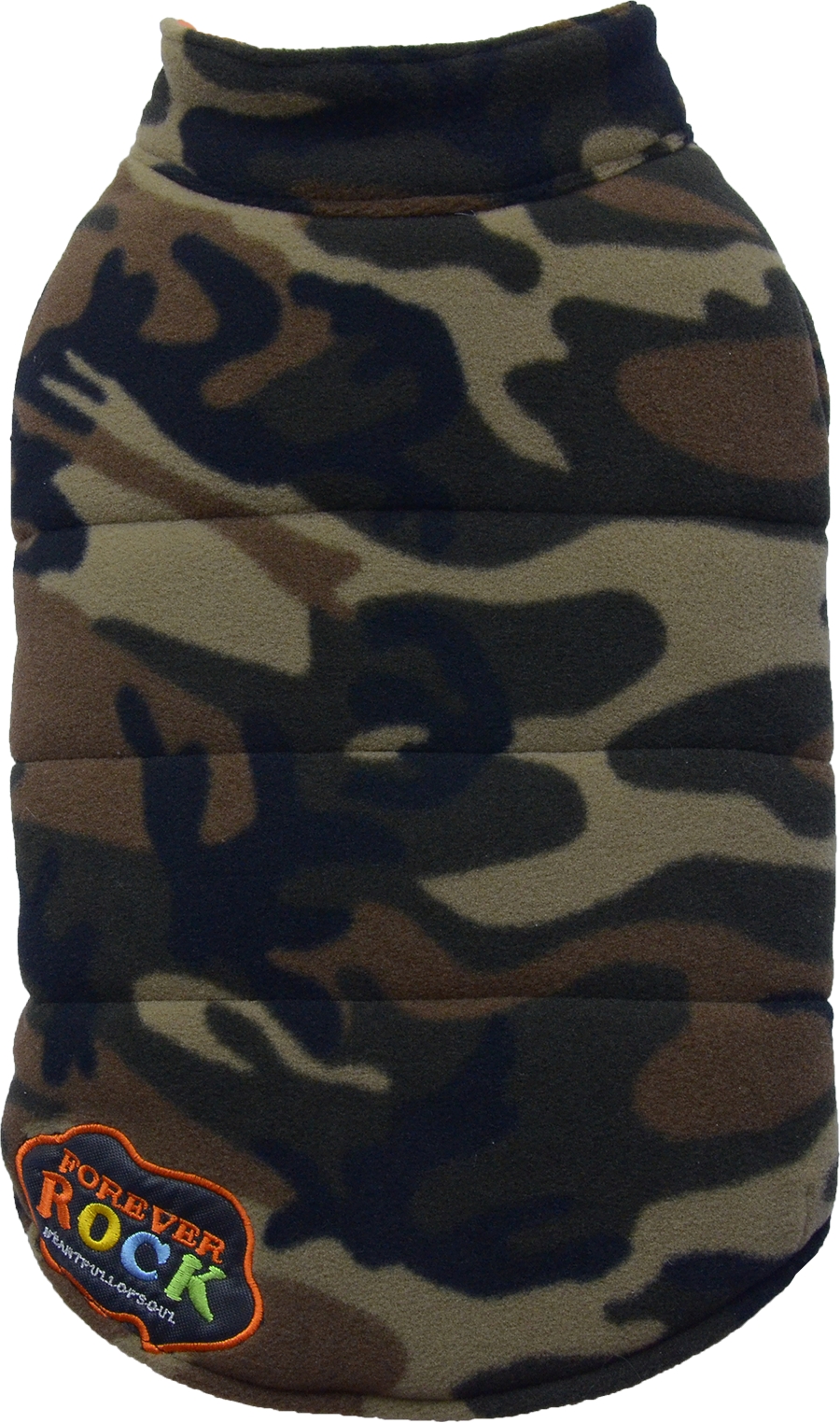 Caldo smanicato in pile mimetico, imbottito. Chiusura in velcro.