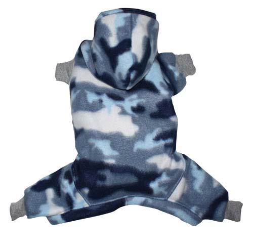 Tutina in caldo e morbidissimo pile mimetico blu 4 zampe con cappuccio e polsini elasticizzati. Coulisse regolabile sul fondo.