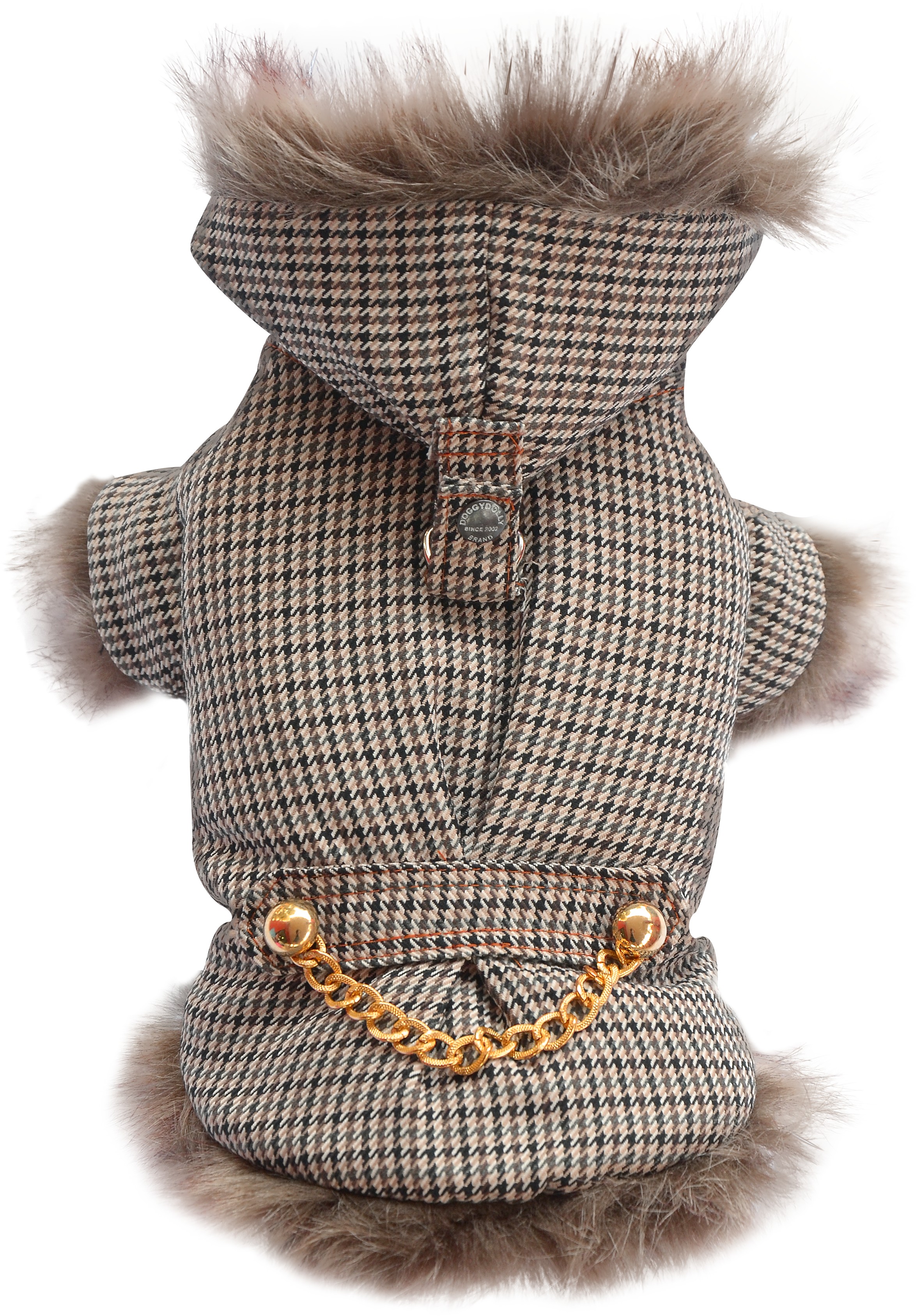Elegante giubbino imbottito bordato di pelo rigorosamente sintetico ed arricchito da martingala con catenella dorata. Cappuccio e chiusura velcro.