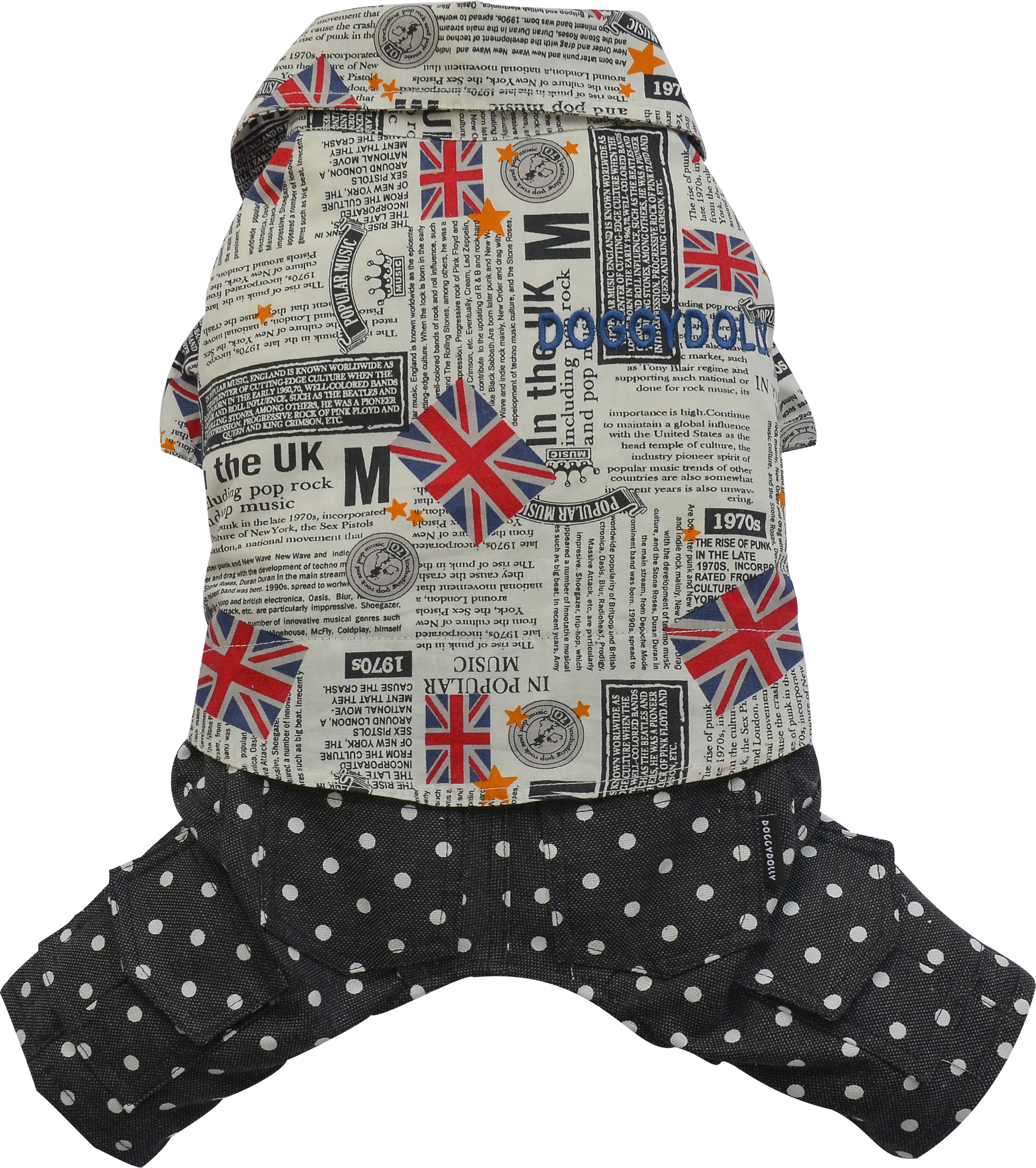 Pantaloni per cani con 4 taschine, in cotone nero a pois bianchi abbinato a camicia con fantasia giornale. Chiusura velcro.