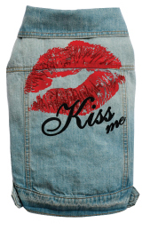 Giubbino in jeans per cani, smanicato e con stampa bacio. Chiusura velcro.